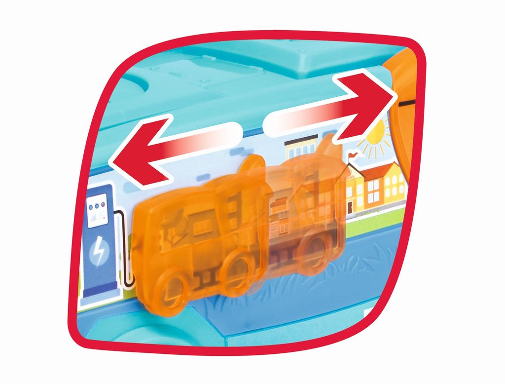 Autobus na volnoběh, s otočným chrastítkem s cílovou stanicí, s otevíracími dveřmi a bočním pohyblivým prvkem. Délka 22 cm.
