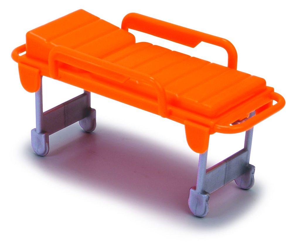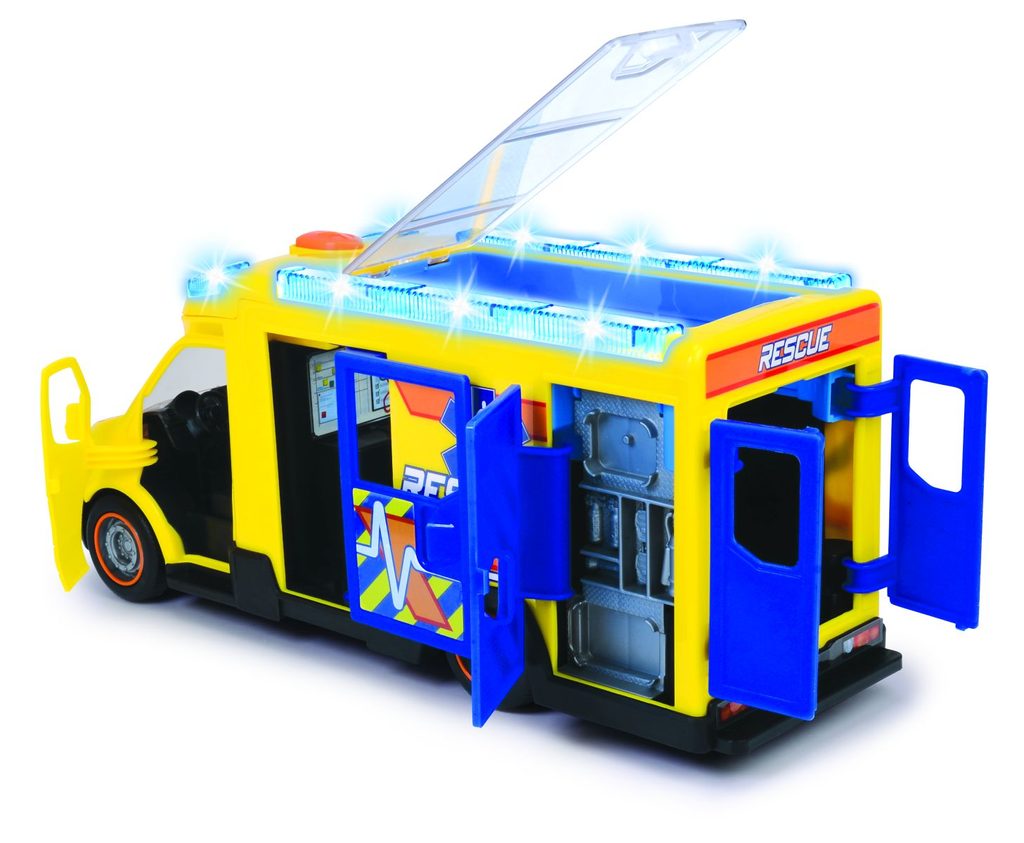 Ambulance na volnoběh, světelný a zvukový efekt, otevírací dveře a střecha, interiér, lehátko a další příslušenství. Délka 34,5 cm.