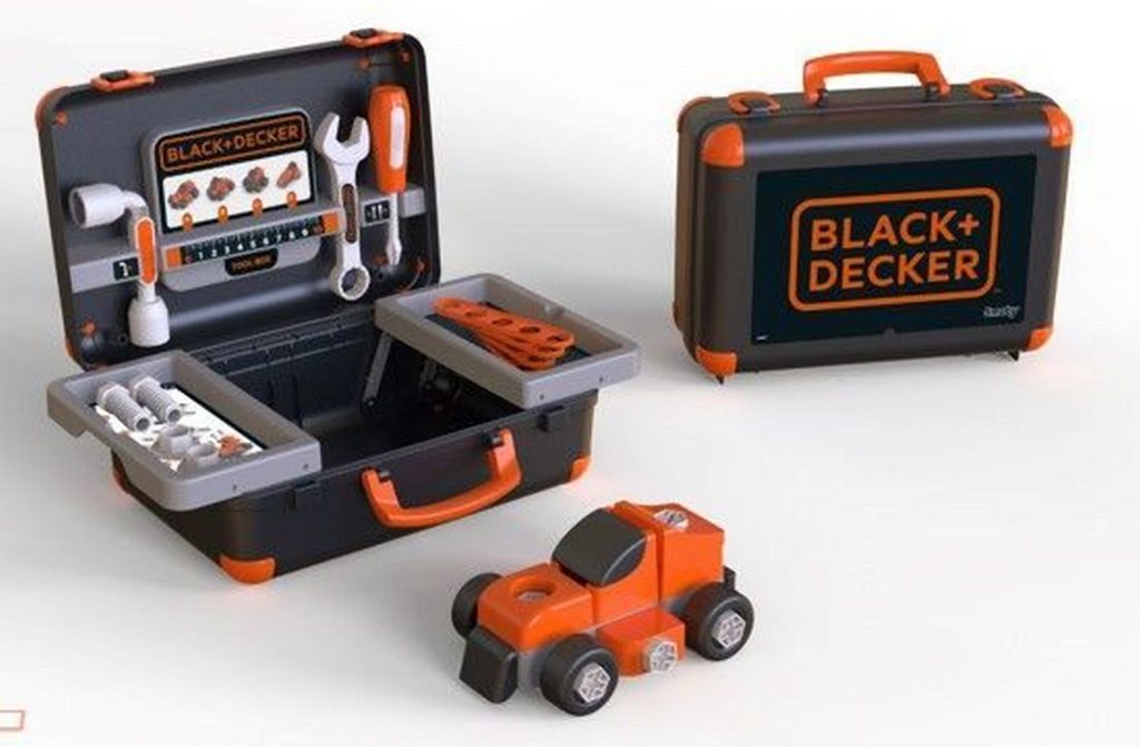 Kufr na nářadí B+D s výklopnými úložnými přihrádkami včetně 3 kusů nářadí, šroubů, matic a částí, ze kterých lze vyrobit. Rozměry rozbaleného výrobku: 35,50 x 28,50 x 28,60 cm. Vhodné od 3 let.