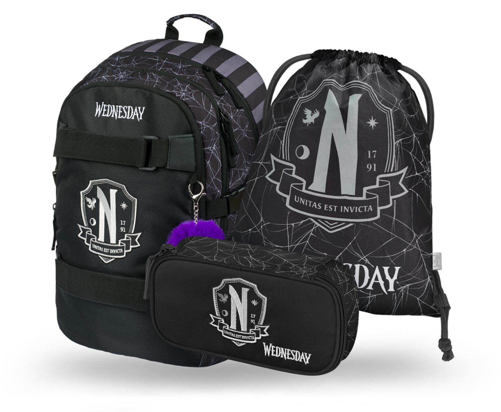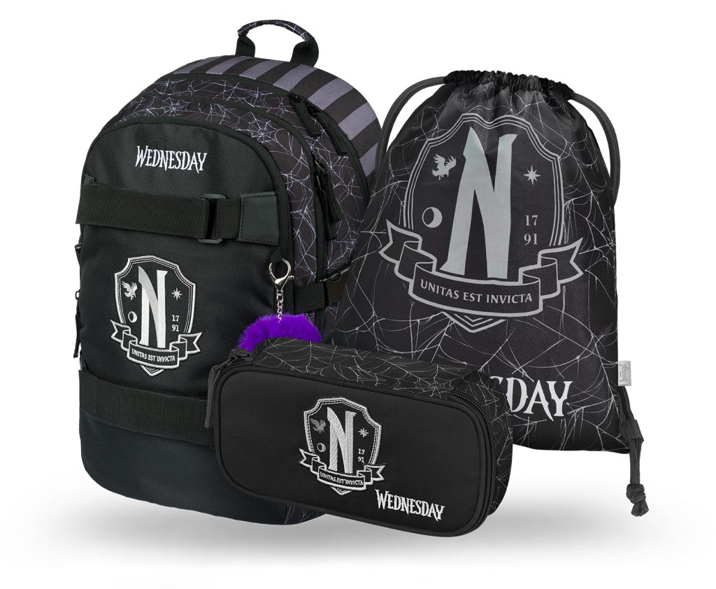 Krásná novinka pro všechny milovníky. Do školy stylově. BAAGL 3 SET Skate Wednesday Nevermore: batoh, penál, sáček