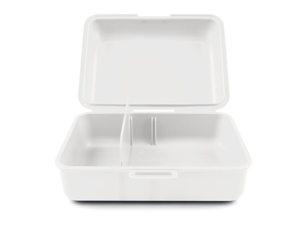 • Plastový box na svačinu v bílé barvě.