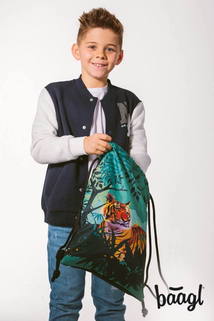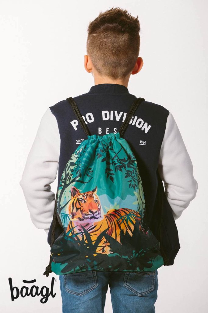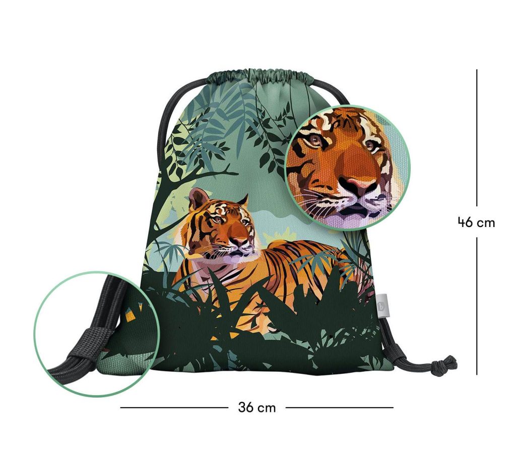 Klučičí sáček na obuv nebo na tělocvik Tygr je vyroben z pevného voděodolného materiálu se silnými šňůrami pro pohodlné nošení na zádech.