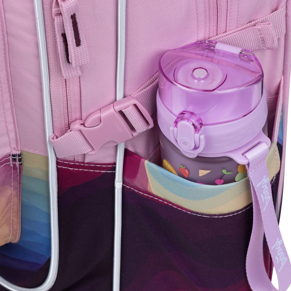 • Boční kapsy z pevného materiálu, které jsou vhodné pro jednu z našich láhví na pití.