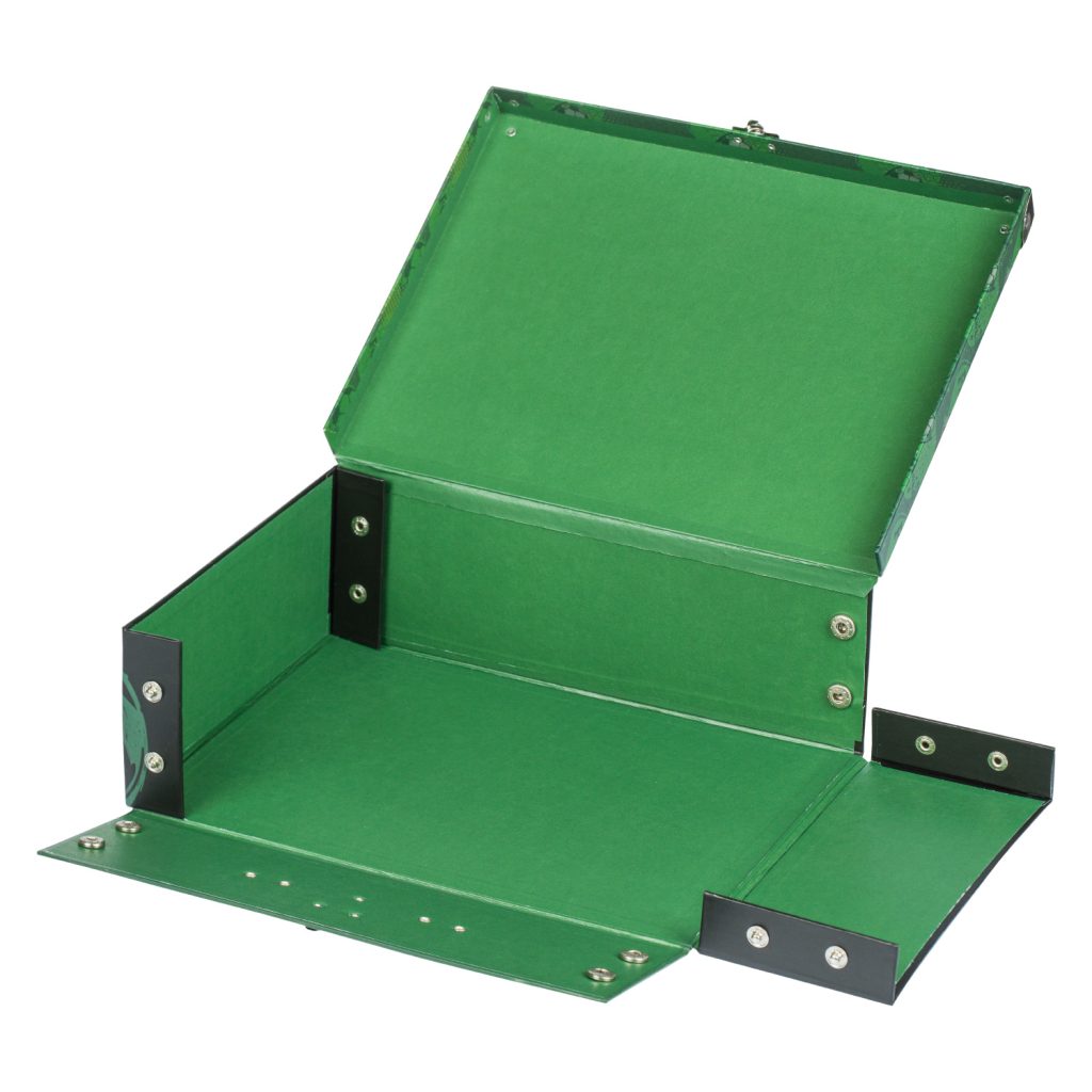 • Skládací kufřík z pevného laminovaného papíru s okovanými rohy.