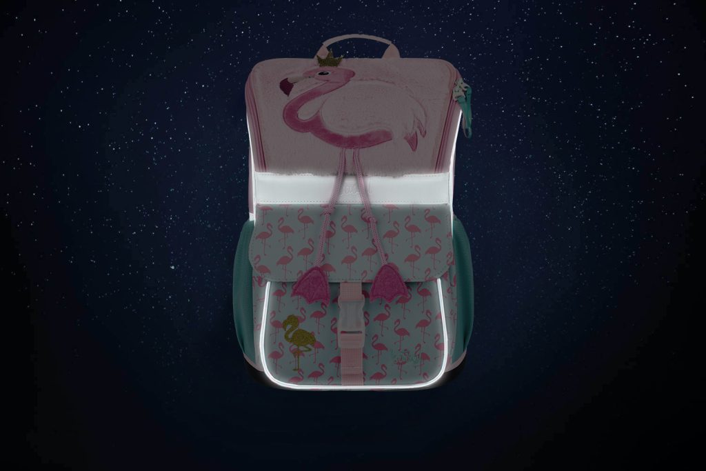 Školní aktovka Zippy Plameňák s příjemným plyšovým povrchem v růžovo-tyrkysové barvě, vhodná pro žáky 1.–2. třídy ZŠ.