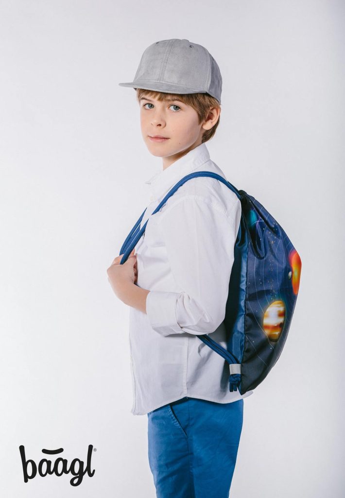 Tmavý školní šáček na obuv s planetami na noční obloze, je vyrobený z pevného voděodolného materiálu a má silné šňůrky pro pohodlné nošení na zádech.