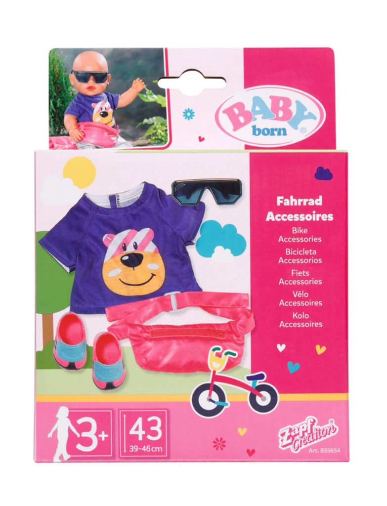 BABY born Doplňky na kolo obsahují tričko, boty, ledvinku a sluneční brýle. S novými cyklistickými doplňky je BABY born připravena na příští cyklovýlet. BABY born teď může šlapat ještě usilovněji, má totiž nové cyklistické boty s protiskluzovou podrážkou. Praktická růžová ledvinka má velikost tak akorát, aby se do ní vešly stylové sluneční brýle a roztomilé náhradní tričko, kdyby náhodou BABY born ukáplo trochu zmrzliny, kterou si vychutnává během odpočinkové zastávky.