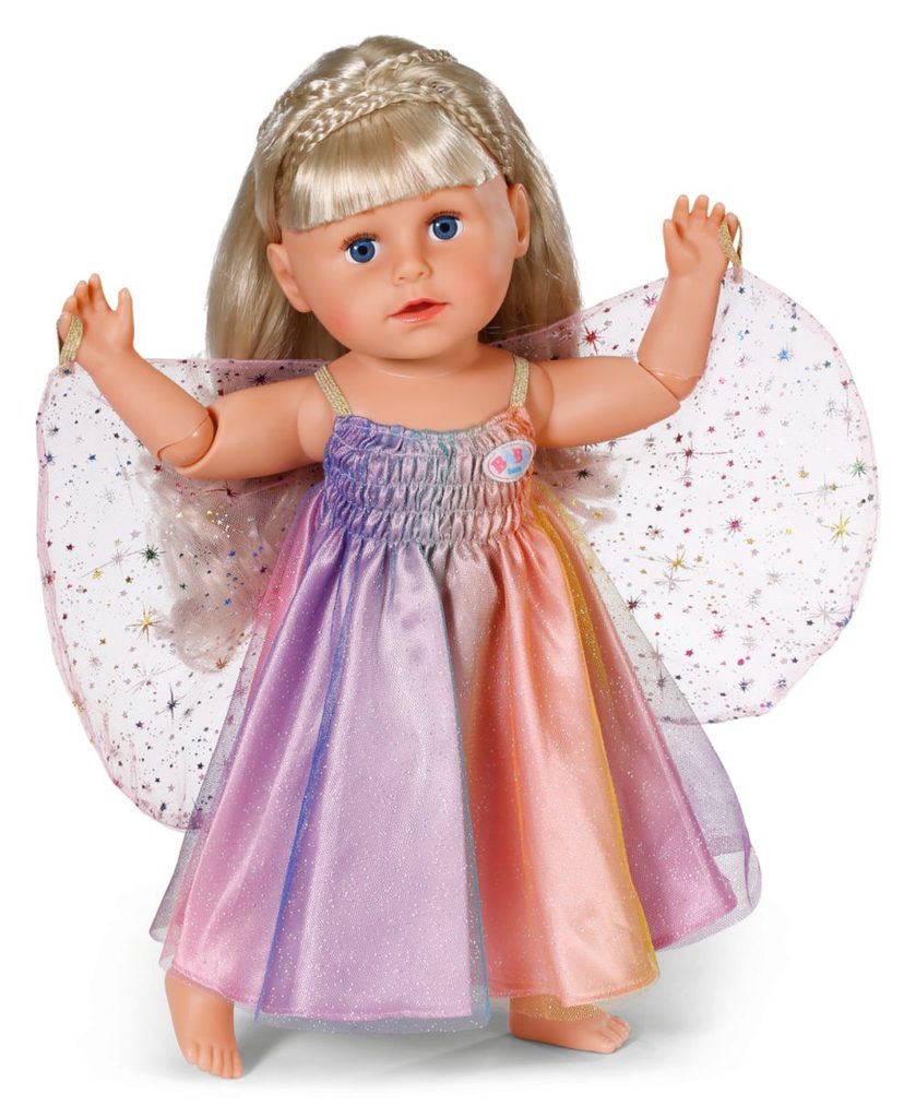 Nápadité duhové šatičky vybízejí ke snění: s našitými křidélky se BABY born vznáší dnem jako víla. Aby mohla mávat křidélky, mají šatičky našitá malá poutka na ruce. Šatičky se třpytí všemi barvami…