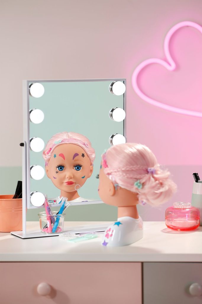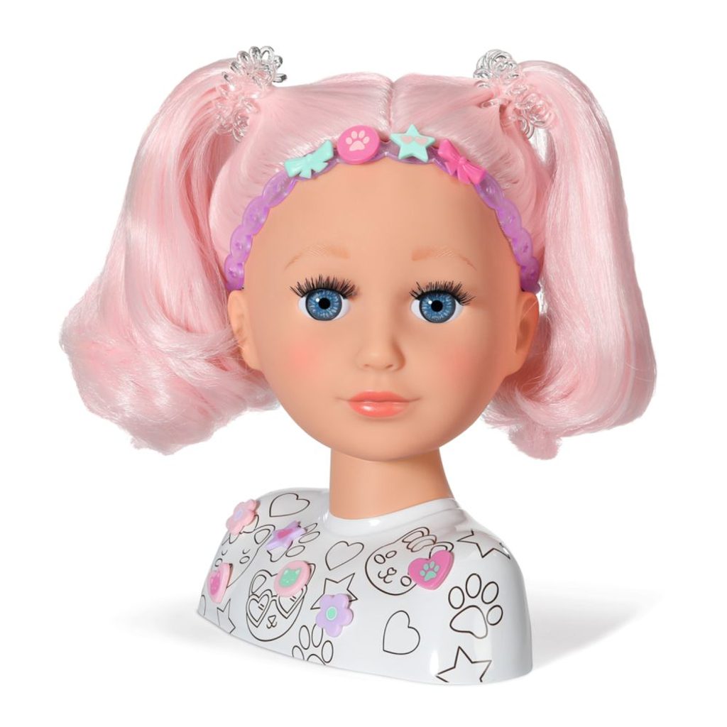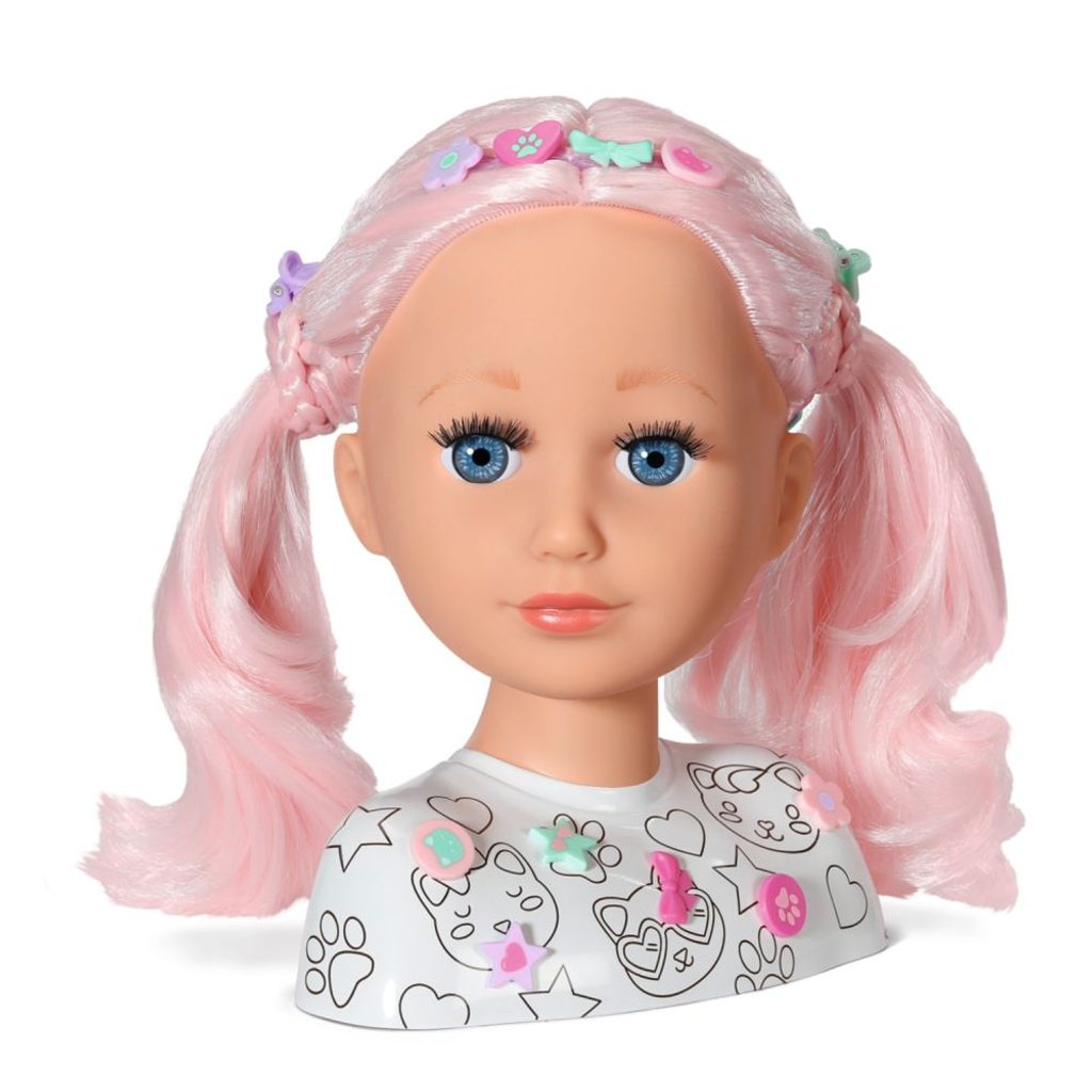 S BABY born Kreativní česací hlavou se fantazii a kreativitě meze nekladou. Česací hlavu vysokou 22 cm lze nalíčit a namalovat pomocí dodaných fixů a šablony. Ale to není vše: vybarvit lze i tričko…