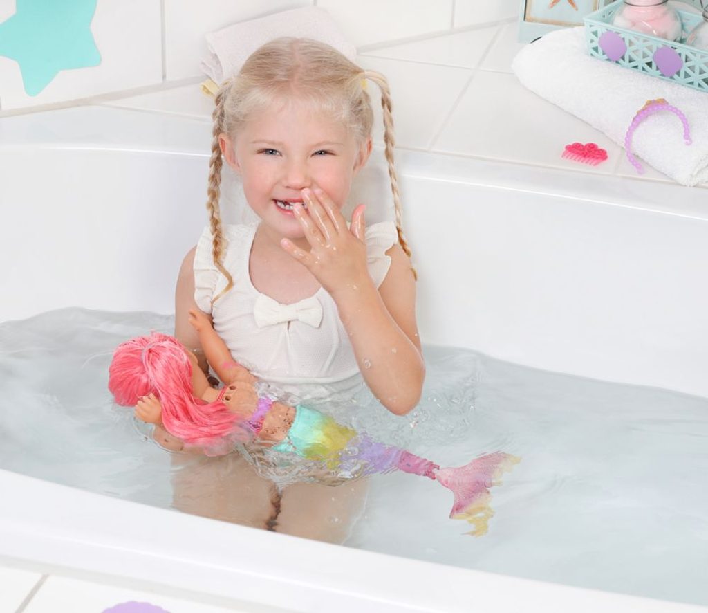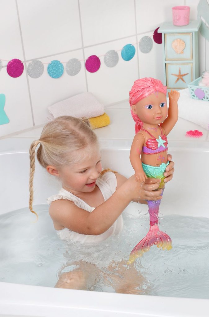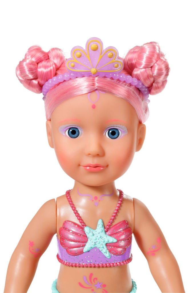 Když pomyslíte na moře, představíte si modrou barvu. Ano, voda je modrá, ale pod vlnami se schovává nádherný svět plný barev. BABY born Little Mořská princezna je skvělým příkladem pestrobarevných tvorů žijících pod vodní hladinou. Její ploutev je nádherně barevná a třpytivá. Při kontaktu s vodou se dokonce hýbe. Horní díl plavek v mušličkovém designu a barevné obrázky na těle víly barevně ladí s ocasní ploutvičkou. Dlouhé blonďaté vlásky má mořská princezna ozdobené fialovou čelenkou. Vlásky lze hřebenem upravit vždy do nového účesu.