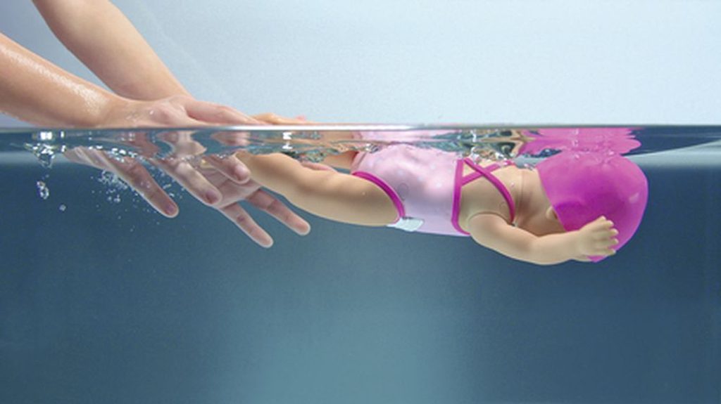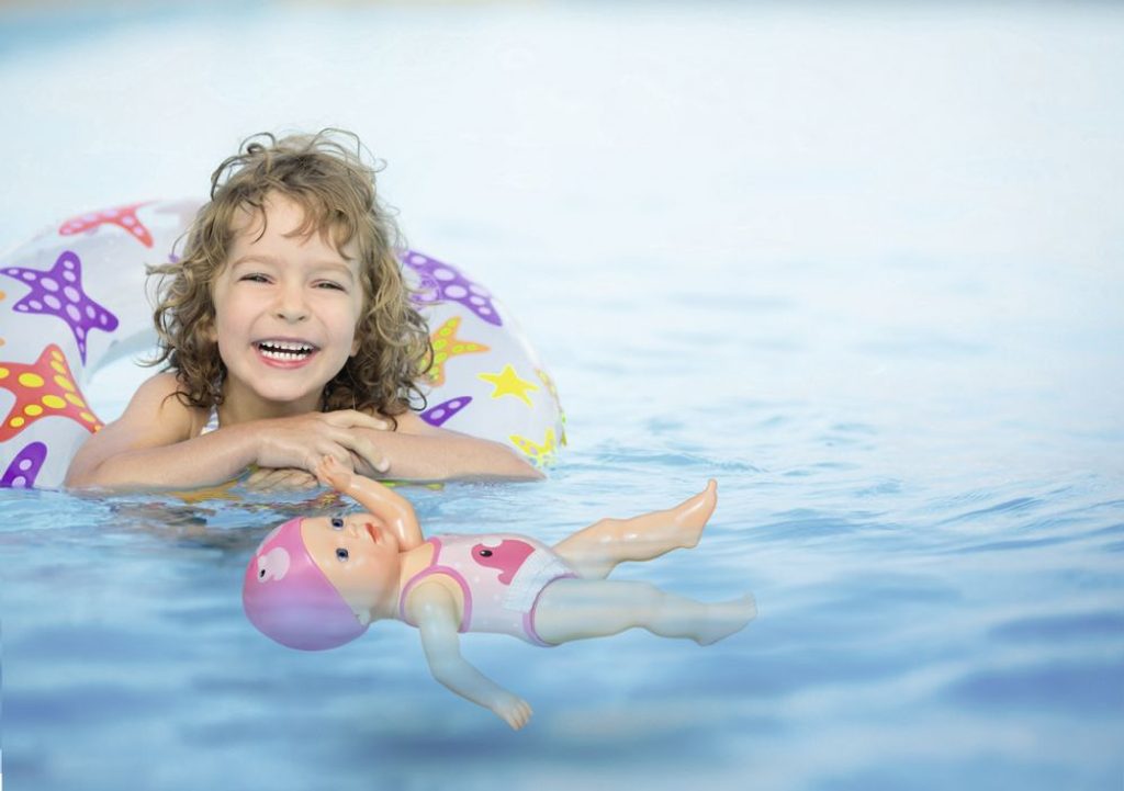 Malá holčička už se toho na hodině plavání tolik naučila. Nejraději má kraul a motýlka. Když plave kraul, střídá ve vodě jednu ruku za druhou, u motýlka rukama hýbe nastejno. A vše bez baterií! Stačí panence natáhnout ruce dozadu a je připravena na další kolo. Když jí ruce uvolníš, začne ve vodě plavat. Nohy a hlava „malého delfína“ jsou také pohyblivé, takže Plaváček může sedět na okraji bazénu a pozorovat svou maminku a tatínka. Plavací čepice a roztomilé plavky s motivem kačenky Berty a s legračními volánky jsou natištěny přímo na těle panenky jako reliéf.