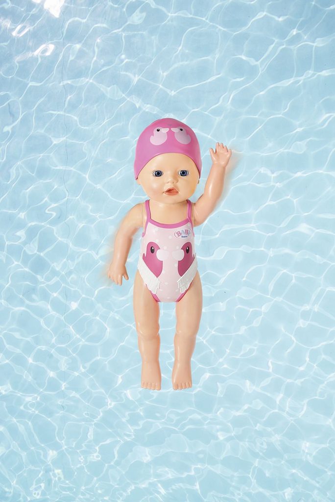 BABY born My First Plaváček ve velikosti 30 cm. Malá holčička už se toho na hodině plavání tolik naučila. Nejraději má kraul a motýlka. Když plave kraul, střídá ve vodě jednu ruku za druhou, u motýlka rukama hýbe nastejno. A vše bez baterií! Stačí panence natáhnout ruce dozadu a je připravena na další kolo. Když jí ruce uvolníš, začne ve vodě plavat. Nohy a hlava „malého delfína“ jsou také pohyblivé, takže Plaváček může sedět na okraji bazénu a pozorovat svou maminku a tatínka. Plavací čepice a roztomilé plavky s motivem kačenky Berty a s legračními volánky jsou natištěny přímo na těle panenky jako reliéf.