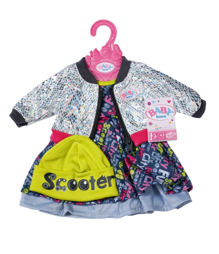 BABY born Oblečení na skútr pro panenky velikosti 43 cm. Součástí jsou šaty, bunda a čepice.