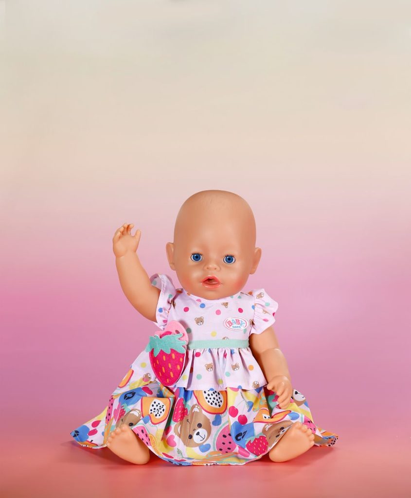 • Kvalitní doplněk pro radost z nápadité, rozmanité a dlouhotrvající hry. Barevné šaty s motivy ovoce, volánkovými detaily a zábavným páskem s ozdobnou jahůdkou.