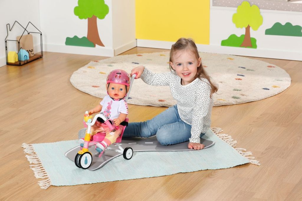 Pozor, přijíždí BABY born! Na své nové tříkolce závodí s medvídkem Teddym a kamarádkou Evou. Díky funkčním kolečkům může BABY born na své tříkolce jezdit jako na skutečné tříkolce. Klakson ve tvaru kačenky Berty se postará o to, aby se jí nikdo nepřipletl do cesty. Poutka na pedály a bezpečnostní pásy zajišťují bezpečnou jízdu. Aby BABY born nemohla jednoduše sama odjet, je k dispozici odnímatelná 45 cm dlouhá vodící tyč, kterou lze k tříkolce připevnit. To znamená, že BABY born lze na tříkolce také vozit na procházky a tlačit ji, pokud jí příliš ztěžknou nohy. V animovaném seriálu pro děti se BABY born Emma na tříkolce vydává na dobrodružnou cestu s kamarádkou Evou a medvídkem Teddym a společně vyrážejí za padající hvězdou. Pokud chcete zažít vzrušující dobrodružství s nimi, podívejte se na náš kanál BABY born v češtině na YouTube.
