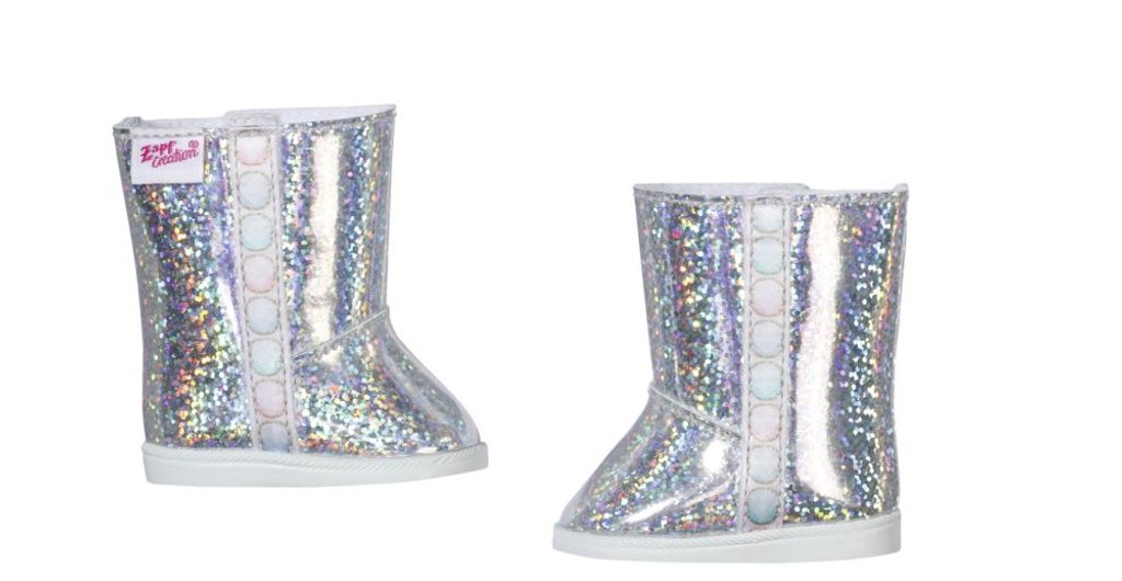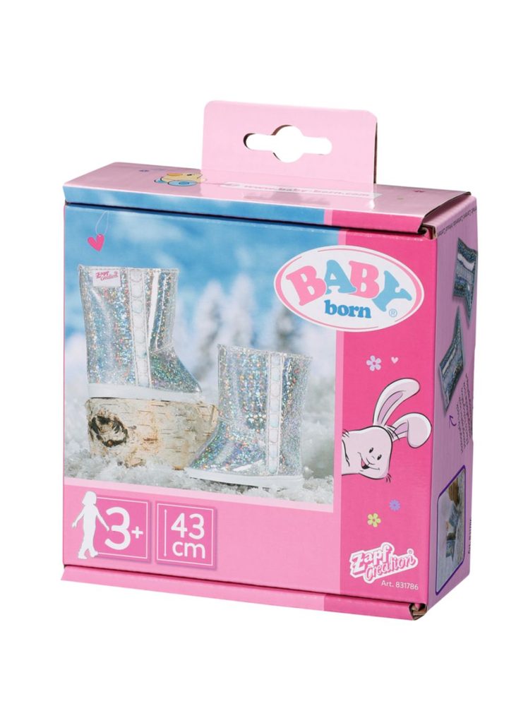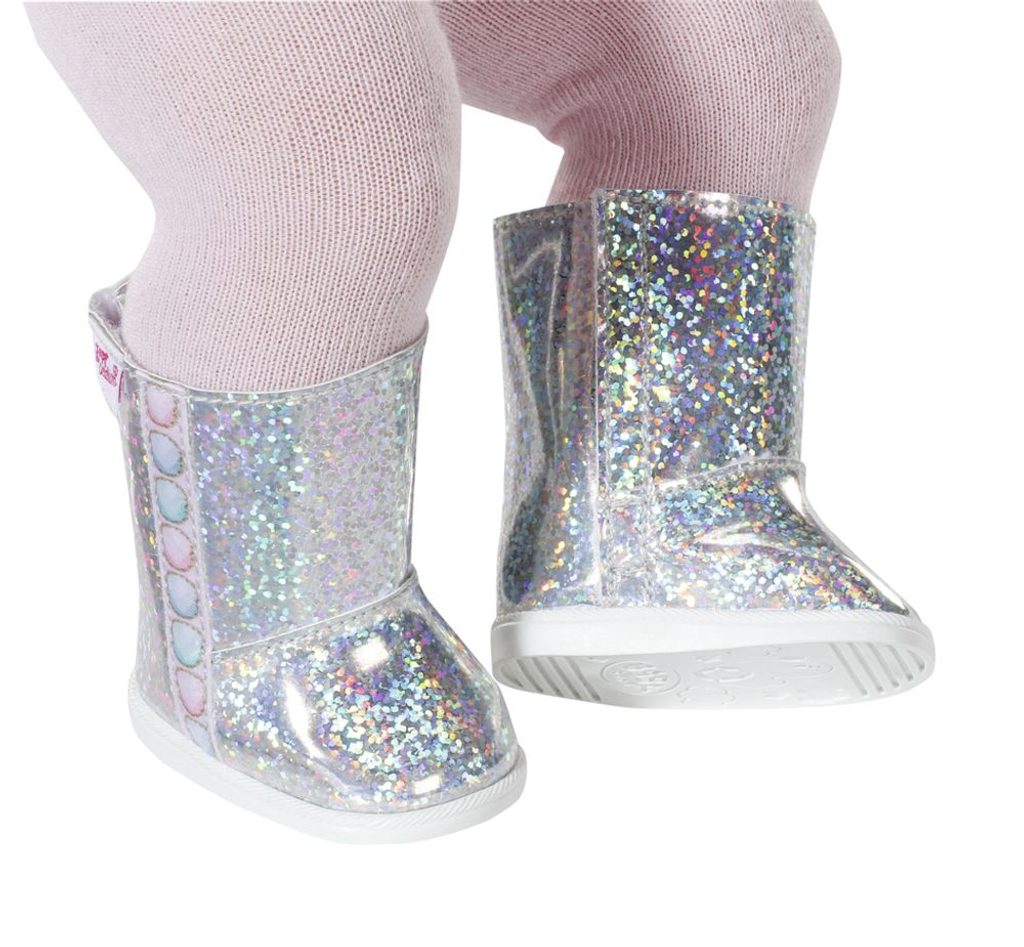BABY born Vysoké zimní boty pro panenky velikosti 43 cm. Nožky musí zůstat v zimě v teple, jinak začne rychle rýma. Je dobře, že se funkce a styl vzájemně nevylučují. Tyto zimní boty mají velmi moderní vzhled. Holografický materiál se třpytí jako ledové krystalky. Podrážka je decentně bílá, takže třpyt vynikne o to více. Na bocích a na nártu zdobí boty zajímavé detaily.