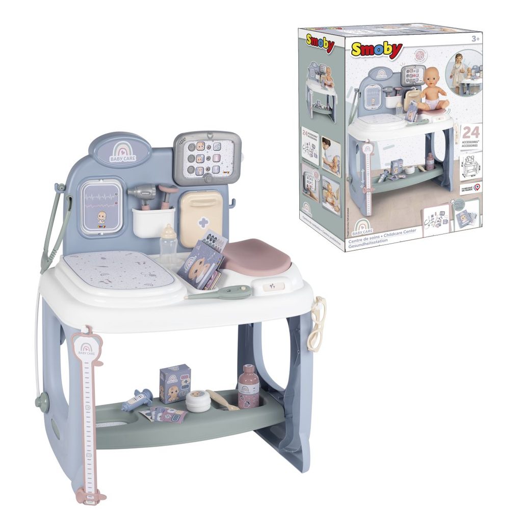 Baby Care centrum umožňuje dětem hrát si na dětského lékaře, vyšetřovat a léčit drobné bolístky jejich panenek, vhodné pro panenky do 38 cm. Skládá se z několika herních ploch a obsahuje spoustu doplňků: samolepící lékařský štítek, lékařské brýle, elektronický tablet (baterie nejsou součástí dodávky), otočná obrazovka s testem zraku a srdečního tepu, brožurka zdravotních záznamů a lékařské formuláře. Součástí je i dětská váha, teploměr, vyšetřovací stůl , stetoskop, otoskop a další. Celkem obsahuje 26 ks příslušenství. Nechybí úložný koš, lékárnička s výklopnou zásuvkou, police, háčky. Vyjímatelný elektronický tablet umožňuje hrát si a povzbuzovat dítě ke hře s panenkou a doplňky. Náhodně se spouští LED a zvuk, který dítěti signalizuje, co je špatně a co má dělat. 3 tlačítka na tabletu, několik zvuků. Dětská panenka není součástí balení. Vyrobeno ve Francii.