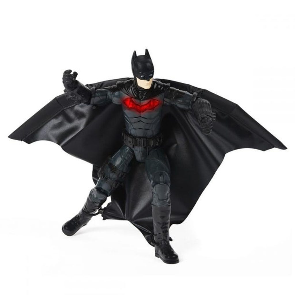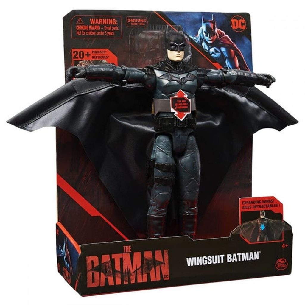 Interaktivní filmová figurka Batmana ve velikosti 30 cm s roztažitelným wingsuit pláštěm. Na hrudi má svítící symbol, který aktivuje zvukové efekty.