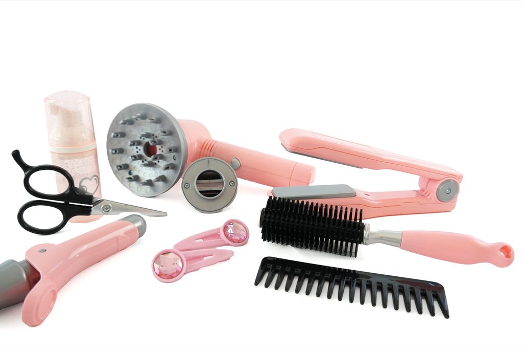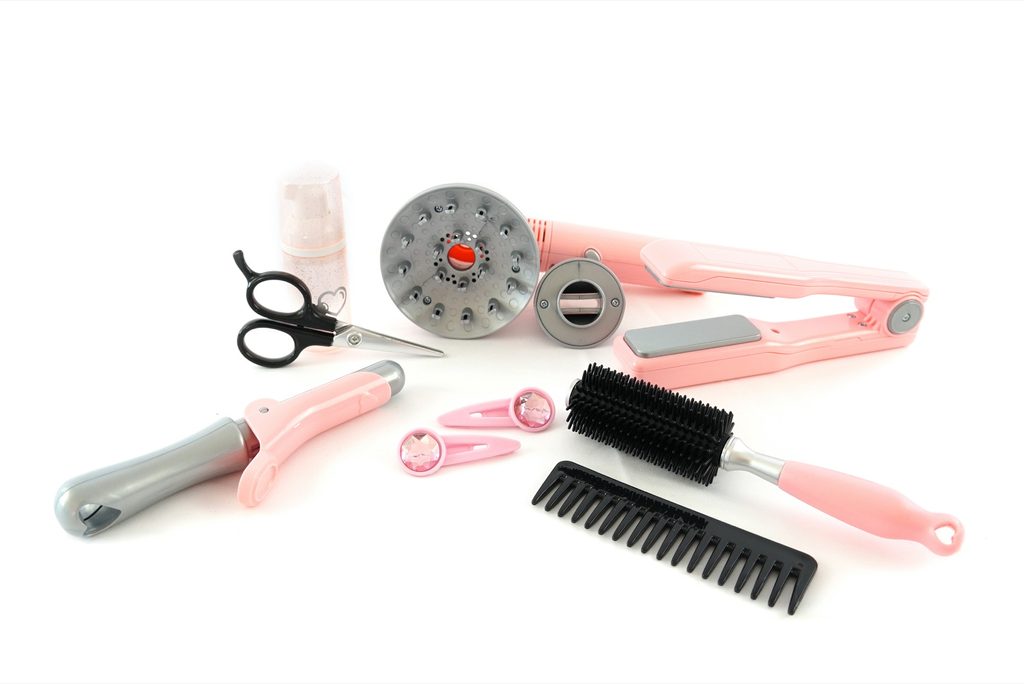 Sada pro kadeřnice v trendové šedo-růžové barvě obsahuje kulmu, fén na baterie s difuzérem, nůžky, hřebínek, kartáč, žehličku na vlasy, sponky, sprej na vlasy. Sada pro kadeřnice v trendové šedo-růžové barvě obsahuje kulmu, fén na baterie s difuzérem, nůžky, hřebínek, kartáč, žehličku na vlasy, sponky, sprej na vlasy.