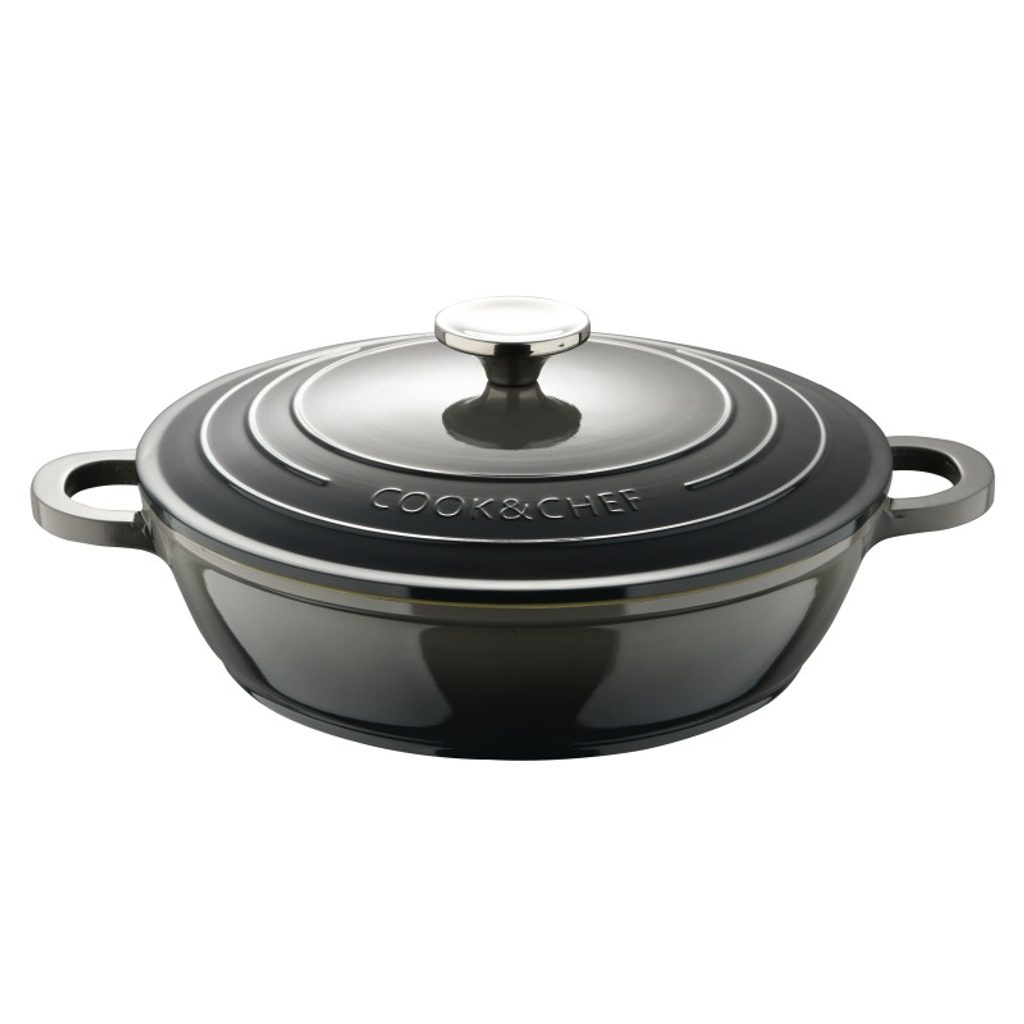 Tento mělký kastrol s víkem je skvělou volbou pro přípravu pokrmů, které vyžadují větší plochu a rovnoměrné prohřátí – ať už se jedná o rizota, paelly, zeleninové směsi nebo dušené maso. Elegantní šedý dvoutónový vzhled doplňuje krémový vnitřní povrch, který usnadňuje vaření i čištění.