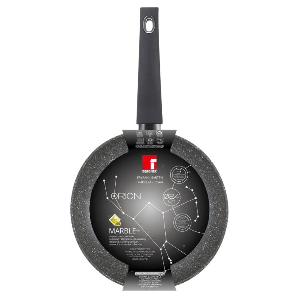 BERGNER Pánev s nepřilnavým povrchem 24 cm Orion BG-8509-MBG • Pánev o průměru 24 cm.• Vyrobeno z kovaného hliníku pro skvělou distribuci tepla.•S vnitřním i vnějším mramorovým povrchem.•Měkká rukojeť.•Šedé provedení s bílými a černými tečkami.•Ochrana proti plameni s barvou.•Indukce po bodech.•Ruka doporučeno umýt.Pánev o průměru 24 cm, která vám ušetří energii a čas! Díky své konstrukci z kovaného hliníku, materiálu se skvělou distribucí tepla. Orion myslel na to, jak získat tu nejlepší chuť pro všechny vaše pokrmy a s vnitřním a vnějším mramorovým povlakem, který zabrání přichycení jídla k jeho povrchu, abyste dosáhli požadovaných výsledků. S měkkou rukojetí, která poskytuje bezpečnost a jistotu během kulinářského zážitku. Jeho design zprostředkuje eleganci vaší kuchyni a vyznačuje se krásným povrchem s černými a bílými tečkami. Doporučujeme ruční mytí.