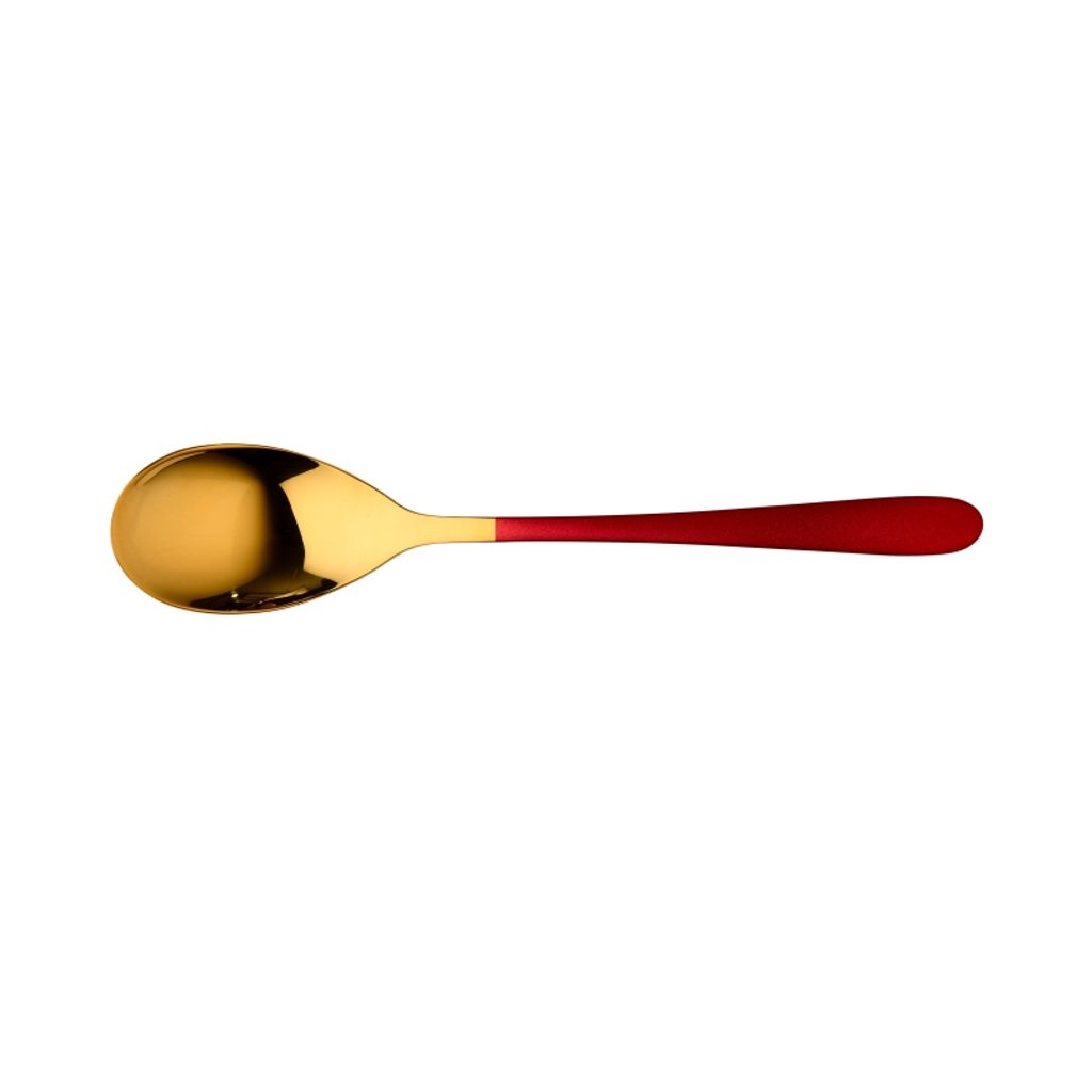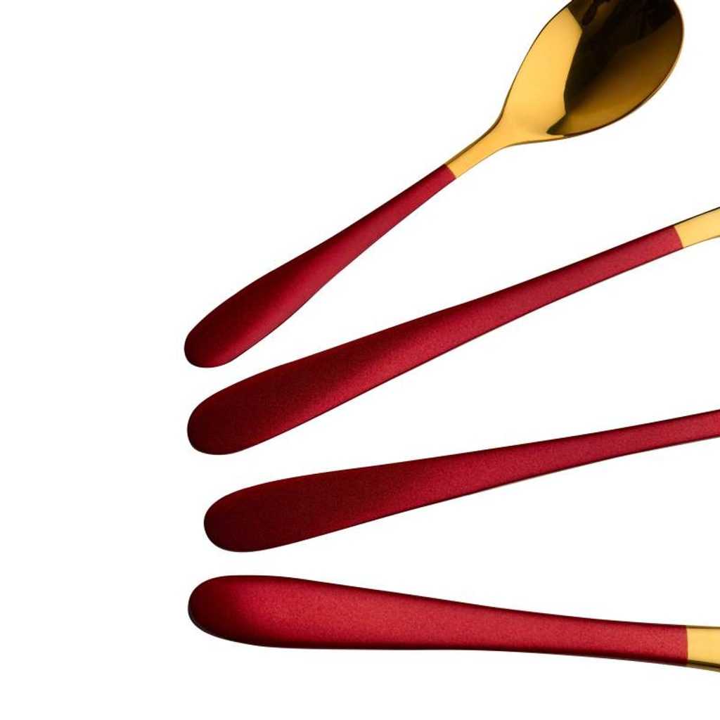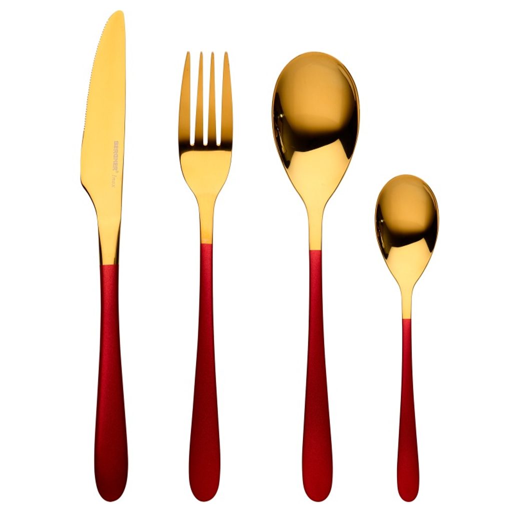 BERGNER Sada příborů nerez 16 ks Lisboa červená BG-45148-RD • Nerezové příbory. Bergner, červená Lisboa kolekce 16 nerezových příborů zaručujících velkou odolnost a dlouhou životnost příborů. • Sada příborů sestávající ze 4 lžic, 4 nožů, 4 vidliček a 4 čajových lžiček. • Elegantní design. Je ideální pro zvláštní příležitosti, jídlo nebo zvláštní událost na oslavu s blízkými. Přináší na stůl dotek odlišnosti a dobrého vkusu. • Vyrobeno z pozlacené nerezové oceli. •Snadno omyvatelné, vhodné do myčky.6dílná sada příborů sestávající ze 4 stolních nožů 23,5 cm, 4 stolních vidliček 21 cm, 4 polévkových lžic 21,5 cm a 4 čajových lžiček 14 cm. Vyrobeno z vysoce kvalitní odolné nerezové oceli s lesklým zlatým PVD povrchem a červeně lakovanou rukojetí. Sada příborů, která je nejen mimořádně funkční, ale také oblékne váš stůl elegancí červené. Snadné čištění, doporučujeme ruční čištění pro prodloužení životnosti produktu.