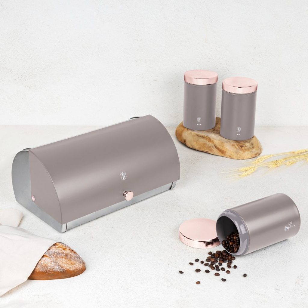 Tento elegantní set chlebníku a tří praktických dóz je ideálním doplňkem pro moderní kuchyň. Vysoká kvalita nerezové oceli, stylová matná taupe barva a sofistikovaný design vytvářejí perfektní kombinaci estetiky a praktičnosti. Set obsahuje chlebník, dózu na cukr, dózu na čaj a dózu na kávu – všechny vyrobené z kvalitní nerezové oceli a navržené tak, aby poskytovaly maximální komfort při každodenním používání.
