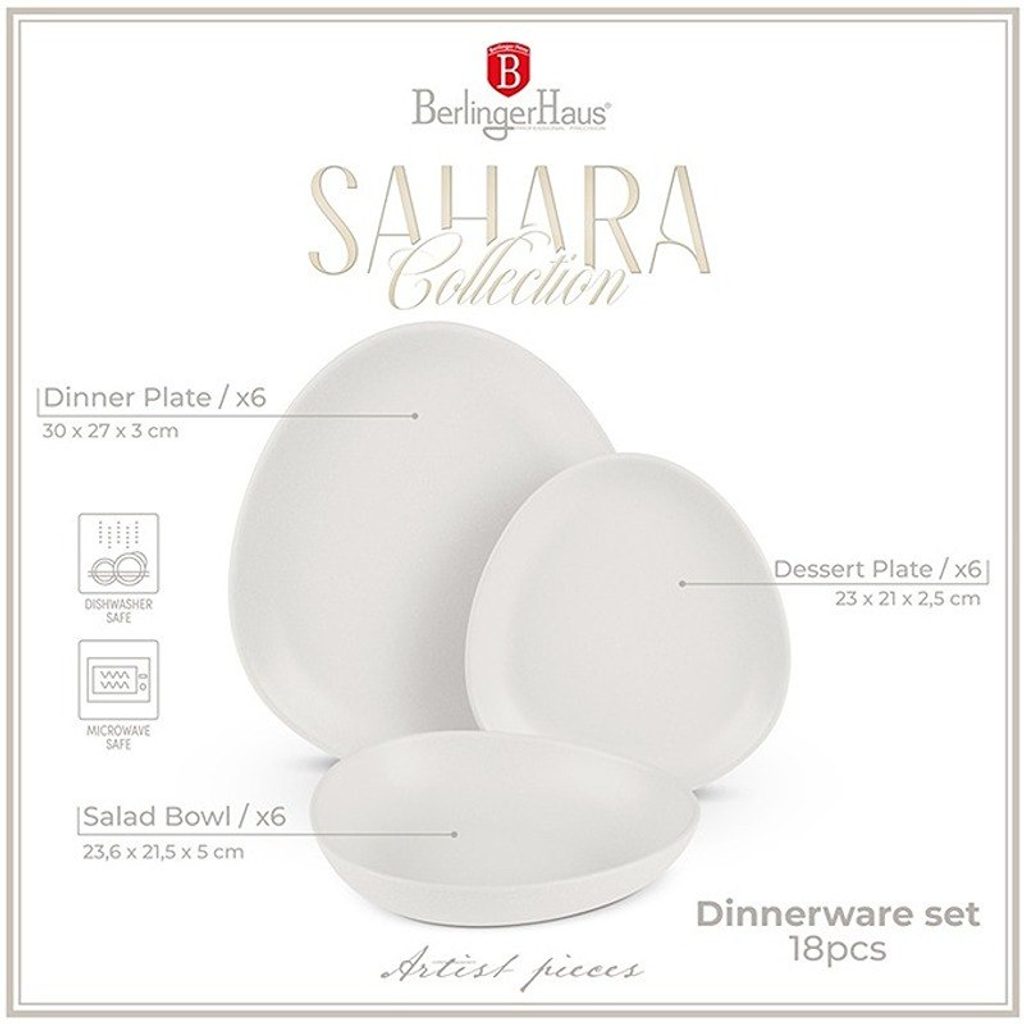 Při stolování záleží na každém detailu. Sada 18dílného nádobí Berlinger Haus BH-10020 Sahara není jen sbírkou talířů a mís – je to vyjádření elegance, vytříbenosti a bezkonkurenční kvality. Tato skvělá sada nádobí, vytvořená pro ty, kteří oceňují v životě jemnější věci, promění každé jídlo ve zvláštní příležitost.