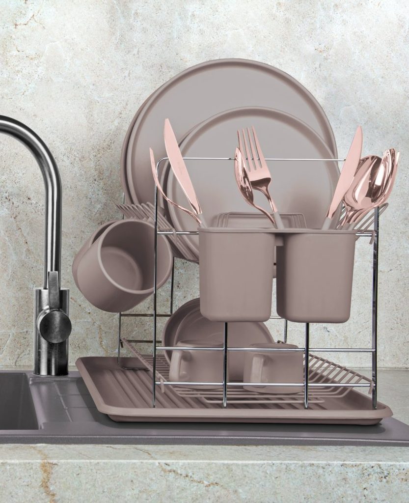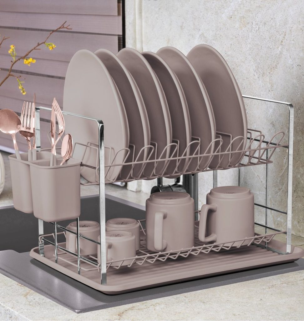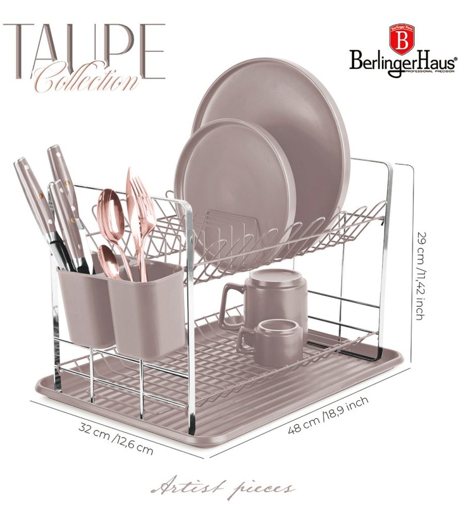 BERLINGERHAUS Odkapávač na nádobí Taupe Collection BH-8596 Dvoupatrový odkapávač na nádobí z kolekce Taupe od BerlingerHaus. Odnímatelný odkapávací tác. Dvě patra pro nádobí či skleničky a dva zásobníky na příbory a náčiní. Jednoduchá údržba a čištění. Designový kousek vyrobený v kombinaci plastu a kovu. Rozměry 48 x 32 x 29 cm