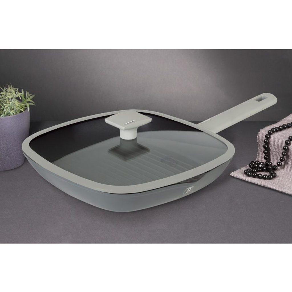 BERLINGERHAUS Pánev grilovací s poklicí s titanovým povrchem 28 cm Aspen Collection BH-7073 Grilovací pánev s titanovým povrchem v šedém designu Aspen Collection. Moderní minimalistický design pánve vás jistě zaujme hned na první pohled. Matný šedý povrch pánve je navíc velmi praktický při dlouhodobém používání. Vnitřní vrstva je potažena 3vrstvým titanovým povrchem, který je charakteristický svou dokonalou nepřilnavostí. Připravované pokrmy se tak nepřipalují a díky tomu se pánev velmi snadno čistí. Zároveň je vhodný pro zdravé vaření s minimem tuku nebo oleje, v závislosti na použitých surovinách klidně i bez jedinné kapky tuku. Titanový povrch, stejně jako ostatní použité materiály, neobsahují žádné škodlivé látky, vaření je tak zcela zdravé a hygienické. Zesílené Turbo indukční dno z nerezové oceli je kompatibilní se všemi druhy varných desek a spolehlivě funguje také na indukci. Jistě oceníte tepelně izolovanou rukojeť, která se při vaření nezahřívá a zůstává stále chladná. pánev Aspen je vhodná pro každodenní vaření, dušení i smažení, perfektně bude vypadat i při servírování hotových jídel přímo na váš stůl.