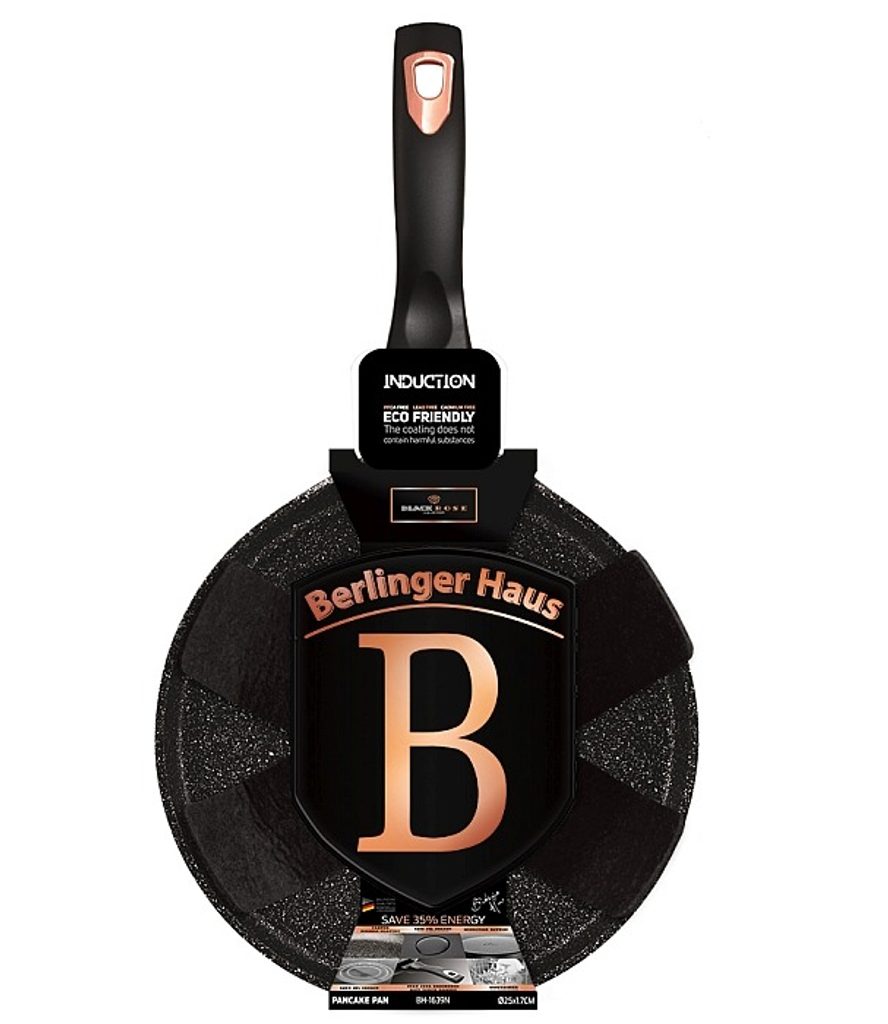 BERLINGERHAUS Pánev na palačinky s mramorovým povrchem 25 cm Black Rose Collection BH-1639 Elegantní pánev na palačinky od značky BerlingerHaus s ergonomickou rukojetí, která při vaření nikdy nepálí. Palačinková pánev má netradičně snížený okraj, aby se vám těsto snadno obracelo. nepřilnavý povrch s mramorovým designem usnadní přípravu palačinek, ke kterým nemusíte přidat ani kapku oleje navíc. Těsto se nepřipaluje a čištění je otázkou jen pár vteřin. Pánev na palačinky je kompatibilní se všemi druhy ohřevu a je vhodná i na indukci.