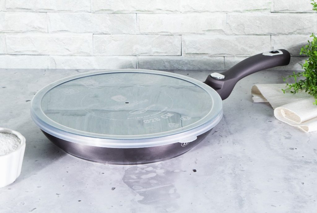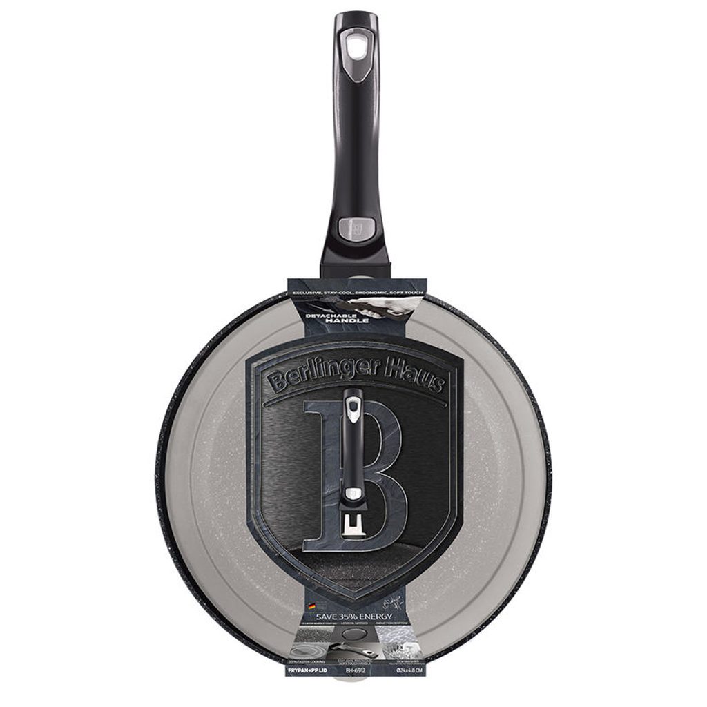 BERLINGERHAUS Pánev s odnímatelnou rukojetí 28 cm Carbon PRO Line BH-6913 Univerzální velká pánev s nepřilnavým povrchem s mramorovým designem a odnímatelnou rukojetí v atraktivním designu Carbon PRO. Pánev je potažena 3vrstvým mramorovým povrchem, který je charakteristický svou dokonalou nepřilnavostí, připravované potraviny se nepřipalují a díky tomu se pánev velmi jednoduše čistí. Zároveň je vhodný pro zdravé vaření s minimem tuku nebo oleje, v závislosti na použitých surovinách klidně i bez jediné kapky tuku. Jedním stisknutím tlačítka lze odnímatelnou rukojeť z pánve sundat a tu poté vložit k dopékání nebo rovnou k pečení do trouby. Nasazení a odejmutí rukojeti zvládnete jednoduše jednou rukou. Jistě to oceníte také při skladování nebo údržbě. K pánvi je navíc praktické víčko, kterým ji lze uzavřít.