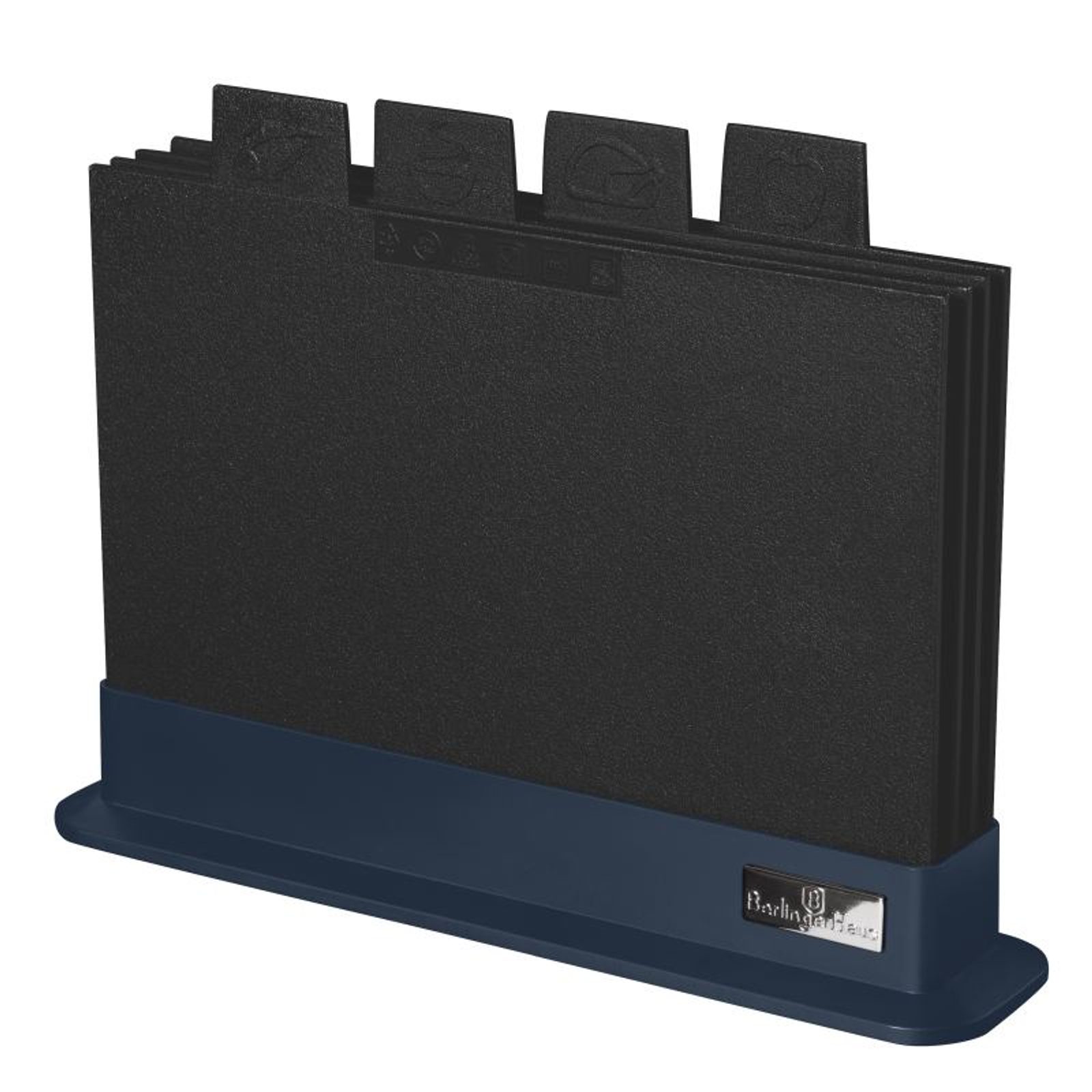 Připravujte své oblíbené suroviny s lehkostí a elegancí díky této praktické sadě pěti krájecích prkének. Vyrobená z odolného plastu v krásné matné modré barvě, sada obsahuje čtyři prkénka označená jazýčky pro snadnou orientaci, abyste mohli bezpečně krájet různé druhy potravin bez obav z křížové kontaminace. Praktický stojan se stříbrným logem udrží vše na svém místě a zajistí pořádek v kuchyni. Lehká a skladná, tato sada je ideální pomocník pro každodenní přípravu jídel.