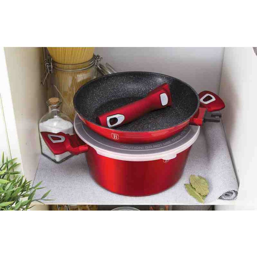 BERLINGERHAUS Sada nádobí s mramorovým povrchem 13 ks Burgundy Metallic Line I BH-7057 Bohatě vybavená sada nádobí z metalické burgundy kolekce zaujme nejen nepřehlédnutelným moderním designem, ale především svými jedinečnými vlastnostmi. V sadě jsou navíc 3 praktická víčka, kterými lze nádoby uzavřít. Větší pánev má odnímatelnou rukojeť a lze ji tak používat pro zapékání v troubě až do 220°C, navíc šetří místo při skladování.