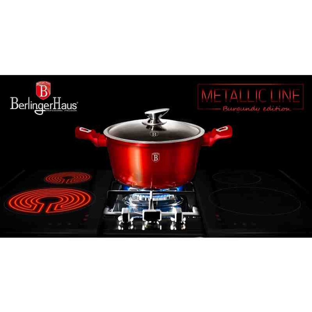 BERLINGERHAUS Sada nádobí s mramorovým povrchem 18 ks Burgundy Metallic Line BH-7035 Bohatě vybavená sada nádobí z metalické burgundy kolekce zaujme nejen nepřehlédnutelným moderním designem, ale především svými jedinečnými vlastnostmi. V sadě jsou navíc 3 praktická víčka, kterými lze nádoby uzavřít.