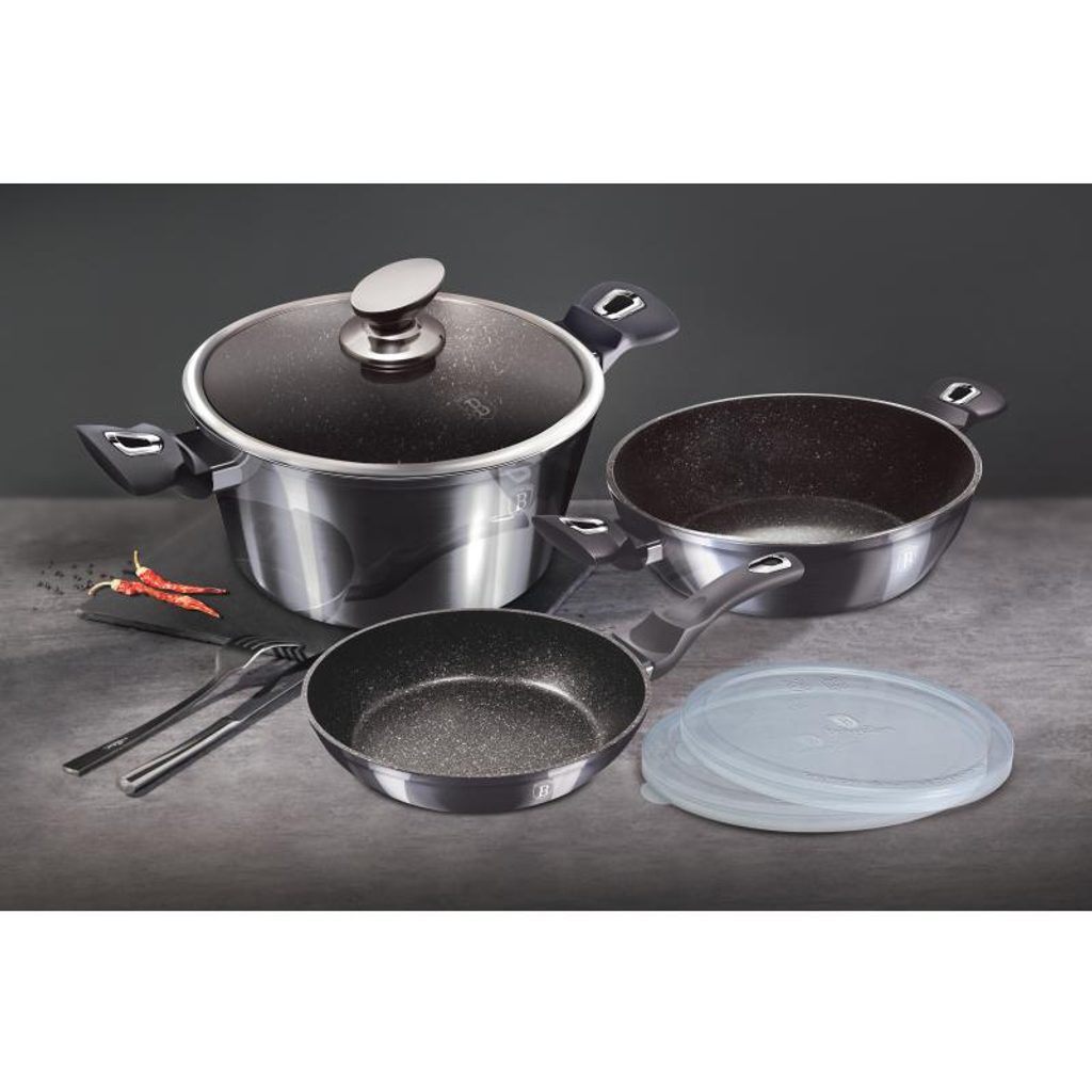 - doménou této sady je 3vrstvý nepřilnavý povrch s mramorovým designem, charakteristický dokonalou nepřilnavostí, žádné potraviny se nepřipalují a díky tomu se kastroly i pánve velice snadno čistí