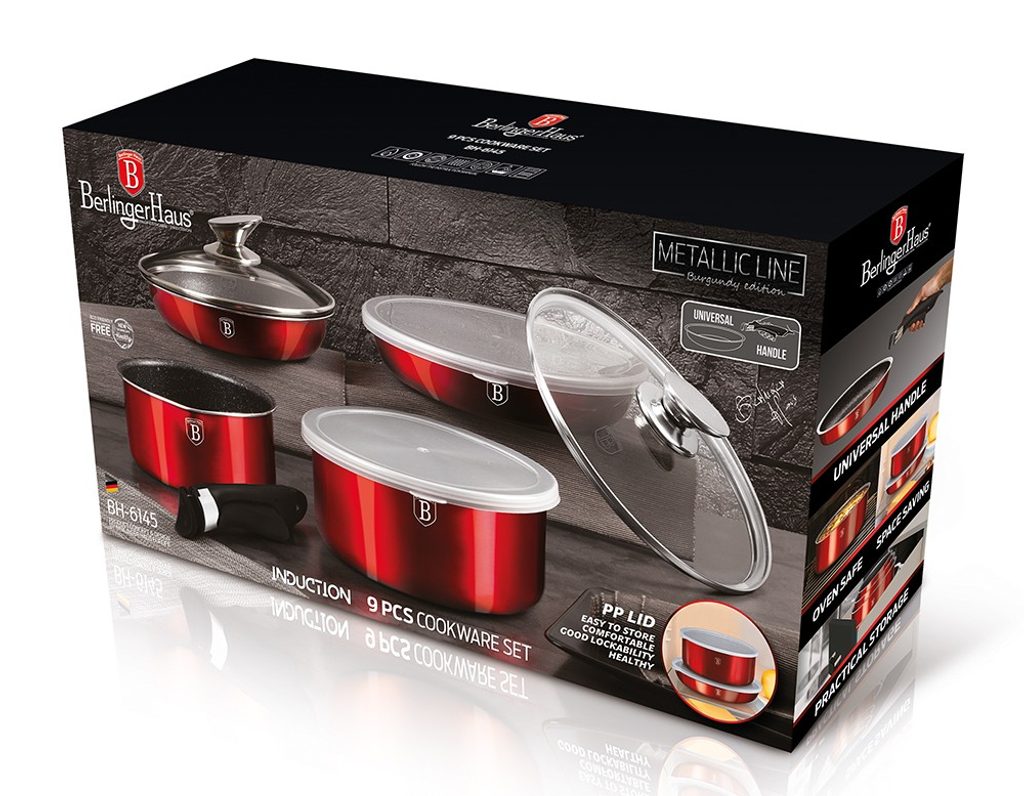 BERLINGERHAUS Sada nádobí s odnímatelnou rukojetí 9 ks Burgundy Metallic Line BH-6145 Jedinečná sada nádobí s odnímatelnou rukojetí z červené kolekce Burgundy Metallic Line.