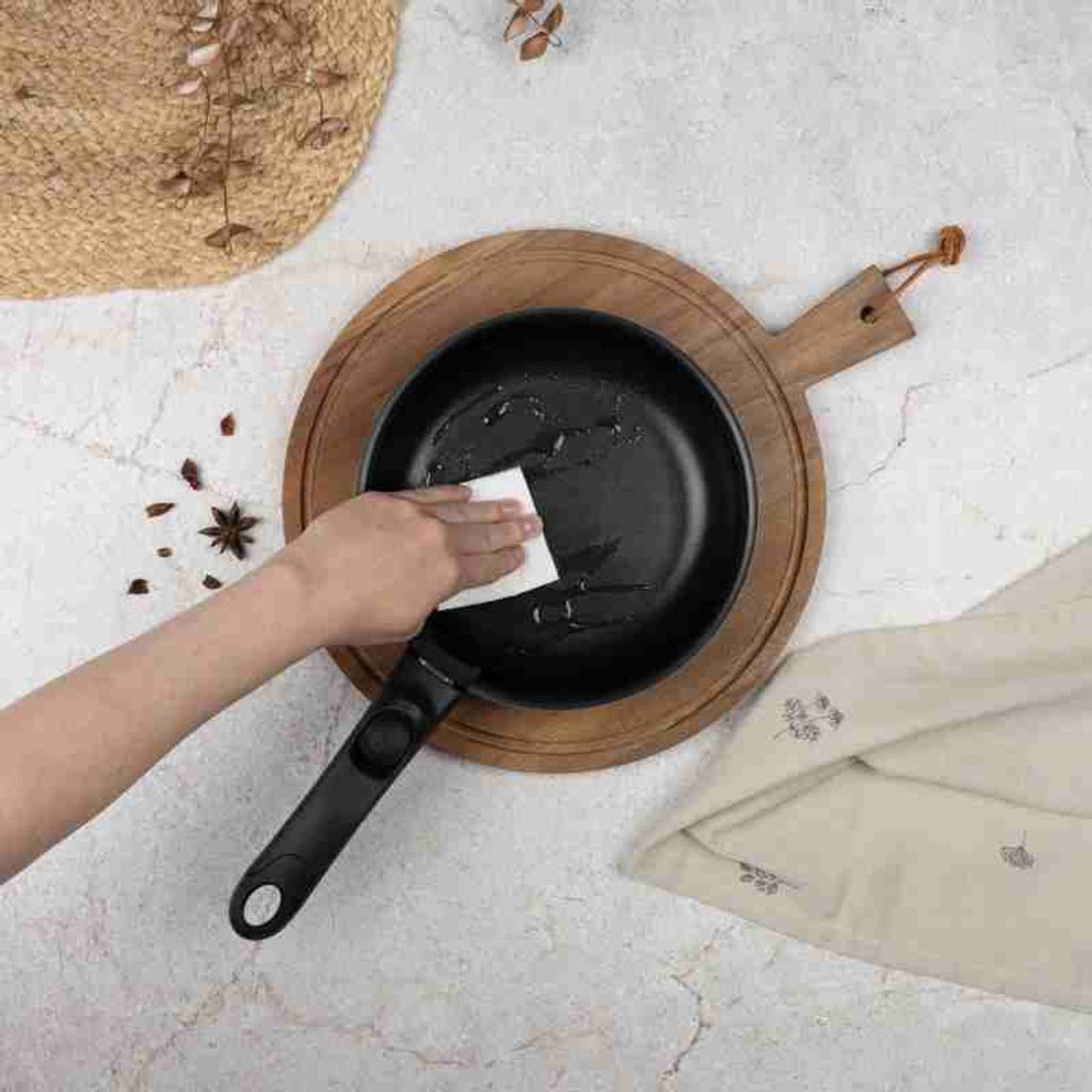 Minimalistický matný povrch v kombinaci modré a šedého dřeva dodává sadě elegantní vzhled, zatímco turbo indukční dno zajišťuje rychlé a rovnoměrné vaření. Víka z tvrzeného skla se systémem Soft Close umožňují bezpečné manipulování a kontrolu vaření.
