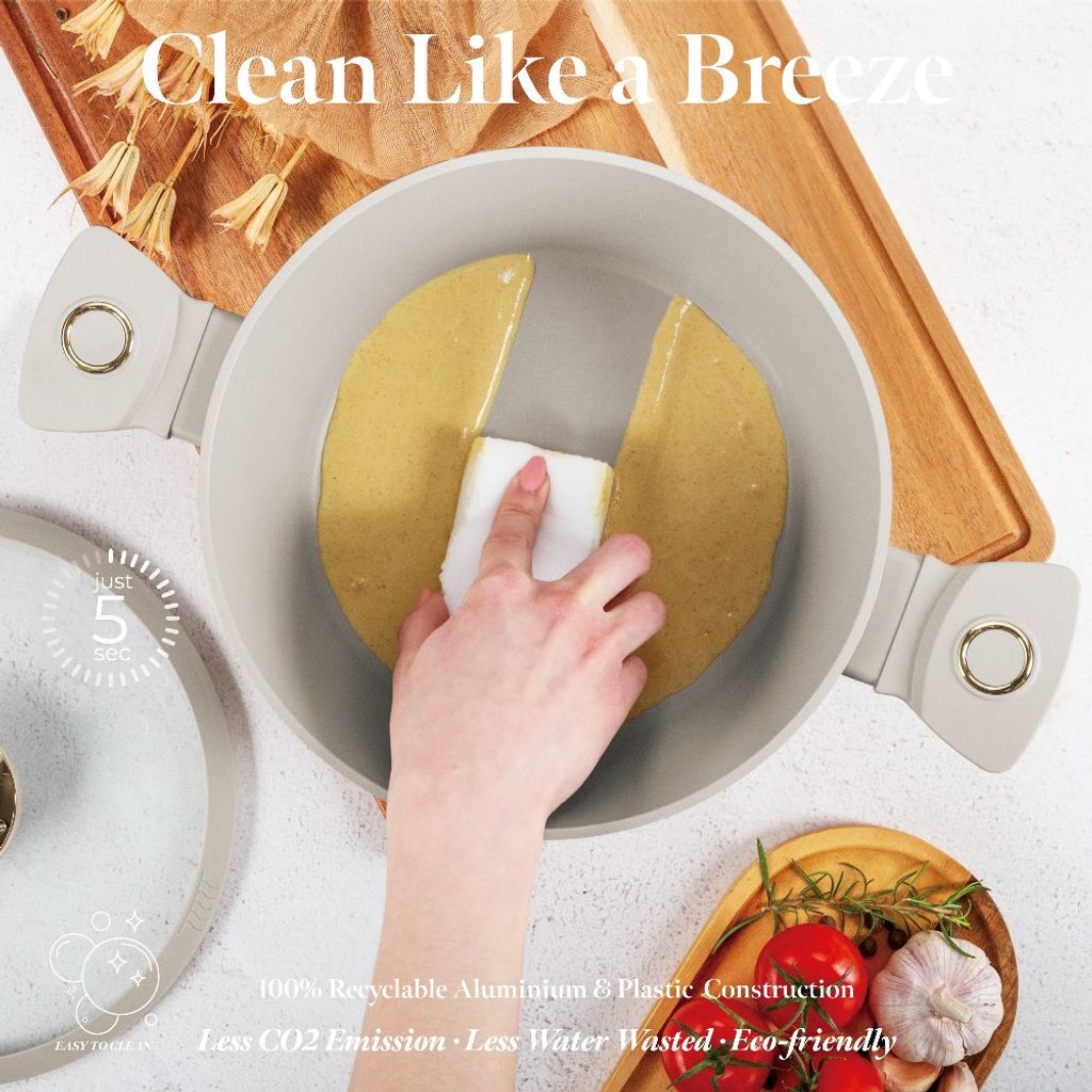 Luxusní design v matné krémové barvě, ergonomické rukojeti Soft Touch Stay Cool – elegantní a pohodlné používání.