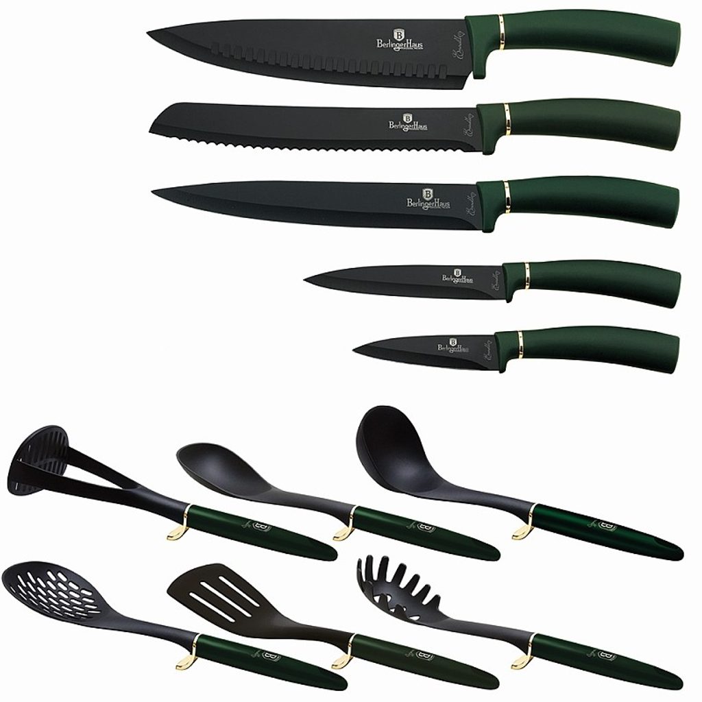 Sada nožů a kuchyňského náčiní ve stojanu 12 ks Emerald Collection je výbornou alternativou pro kuchaře různých úrovní, na jejíž výrobu byl použit kvalitní materiál: nerez ocel s nepřilnavým povrchem, vynikají perfektní ostrostí čepele a designem. Velmi oceníte i ergonomicky tvarovanou rukojeť, díky které se vám nože budou skvěle držet. Celá sada je dílem výrobce BERLINGERHAUS, jež se výrobě nožů věnuje poměrně dlouho a jsou řádně odzkoušeny.