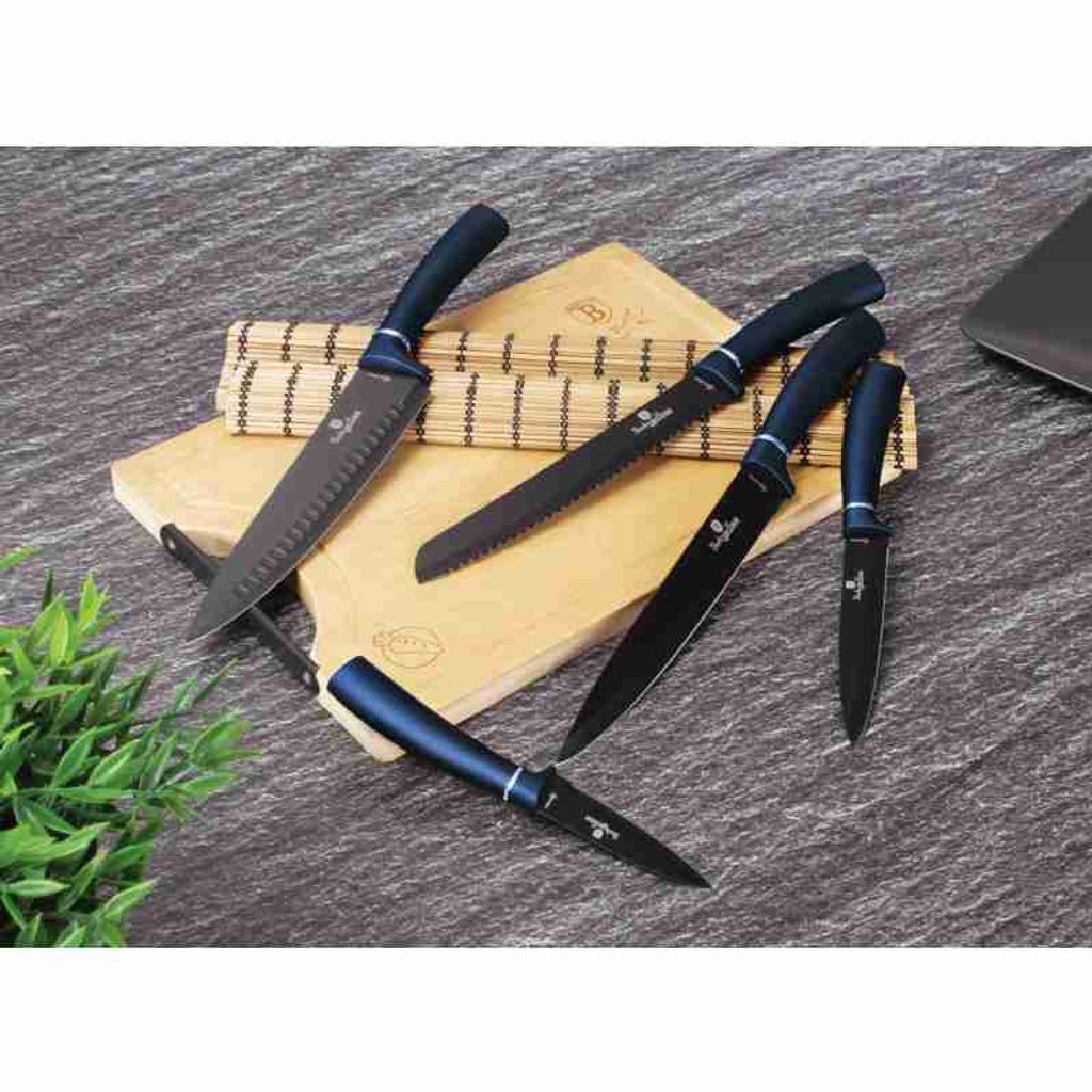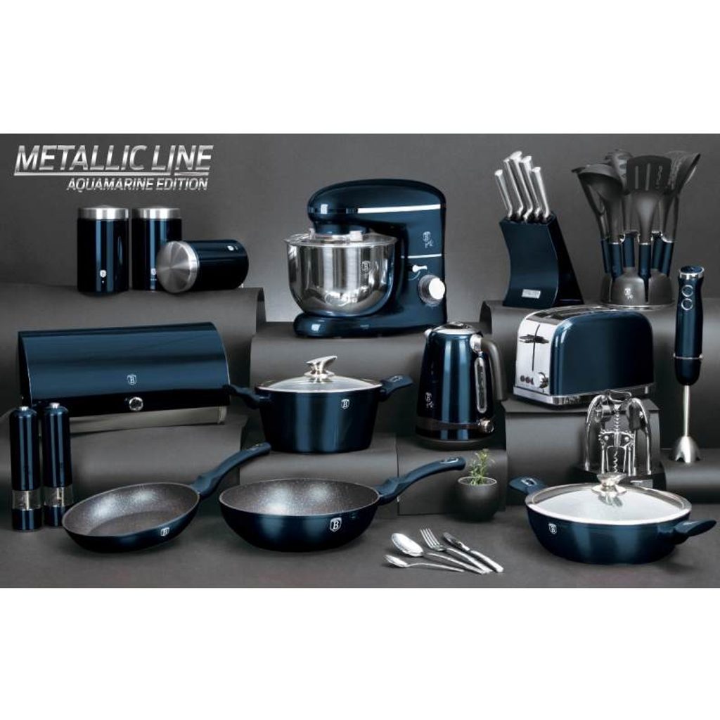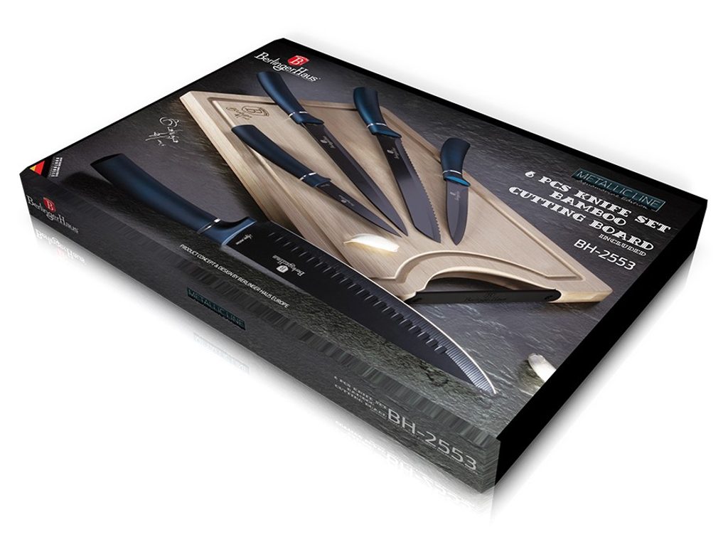Sada nožů s nepřilnavým povrchem + prkénko 6 ks Aquamarine Metallic Line je výbornou alternativou pro kuchaře různých úrovní, na jejíž výrobu byl použit kvalitní materiál: nerez ocel s nepřilnavým povrchem, vynikají perfektní ostrostí čepele a designem. Velmi oceníte i ergonomicky tvarovanou rukojeť, díky které se vám nože budou skvěle držet. Celá sada je dílem výrobce BERLINGERHAUS, jež se výrobě nožů věnuje poměrně dlouho a jsou řádně odzkoušeny.