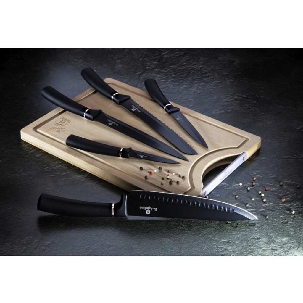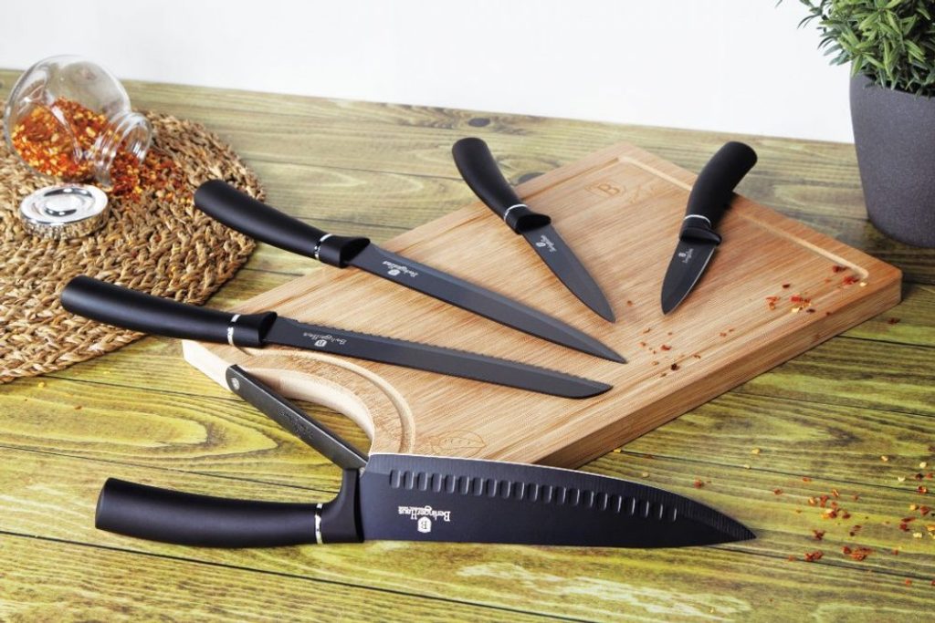 Sada nožů s nepřilnavým povrchem + prkénko 6 ks Black Silver Collection je výbornou alternativou pro kuchaře různých úrovní, na jejíž výrobu byl použit kvalitní materiál: nerez ocel s nepřilnavým povrchem, vynikají perfektní ostrostí čepele a designem. Velmi oceníte i ergonomicky tvarovanou rukojeť, díky které se vám nože budou skvěle držet. Celá sada je dílem výrobce BERLINGERHAUS, jež se výrobě nožů věnuje poměrně dlouho a jsou řádně odzkoušeny.