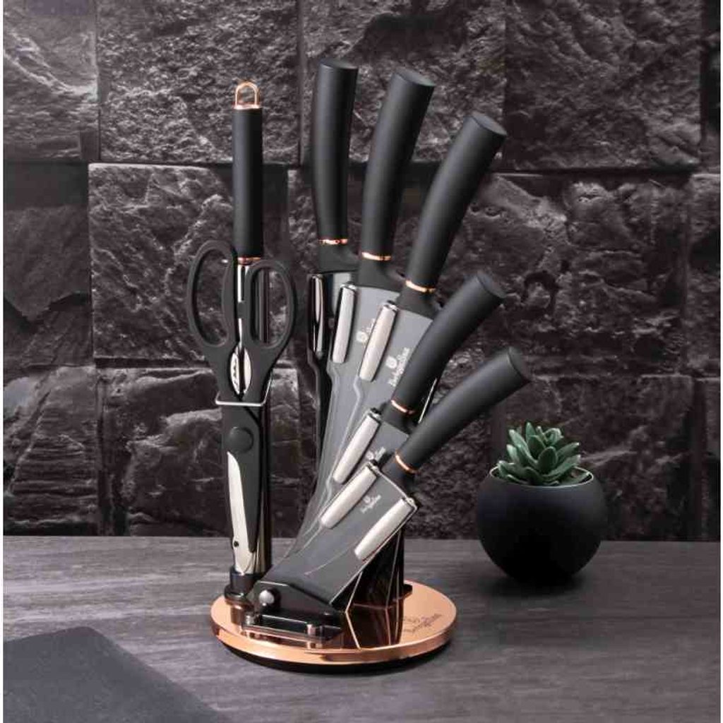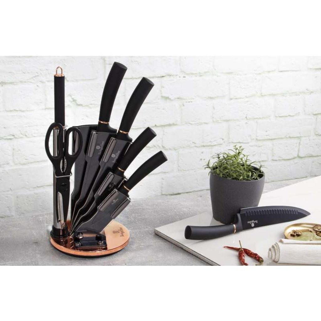 Sada nožů ve stojanu 8 ks Black Rose Collection je výbornou alternativou pro kuchaře různých úrovní, na jejíž výrobu byl použit kvalitní materiál: nerez ocel s nepřilnavým povrchem, vynikají perfektní ostrostí čepele a designem. Velmi oceníte i ergonomicky tvarovanou rukojeť, díky které se vám nože budou skvěle držet. Celá sada je dílem výrobce BERLINGERHAUS, jež se výrobě nožů věnuje poměrně dlouho a jsou řádně odzkoušeny.