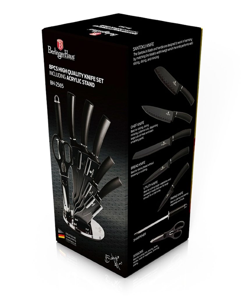 Sada nožů ve stojanu 8 ks Black Silver Collection je výbornou alternativou pro kuchaře různých úrovní, na jejíž výrobu byl použit kvalitní materiál: nerez ocel s nepřilnavým povrchem, vynikají perfektní ostrostí čepele a designem. Velmi oceníte i ergonomicky tvarovanou rukojeť, díky které se vám nože budou skvěle držet. Celá sada je dílem výrobce BERLINGERHAUS, jež se výrobě nožů věnuje poměrně dlouho a jsou řádně odzkoušeny.