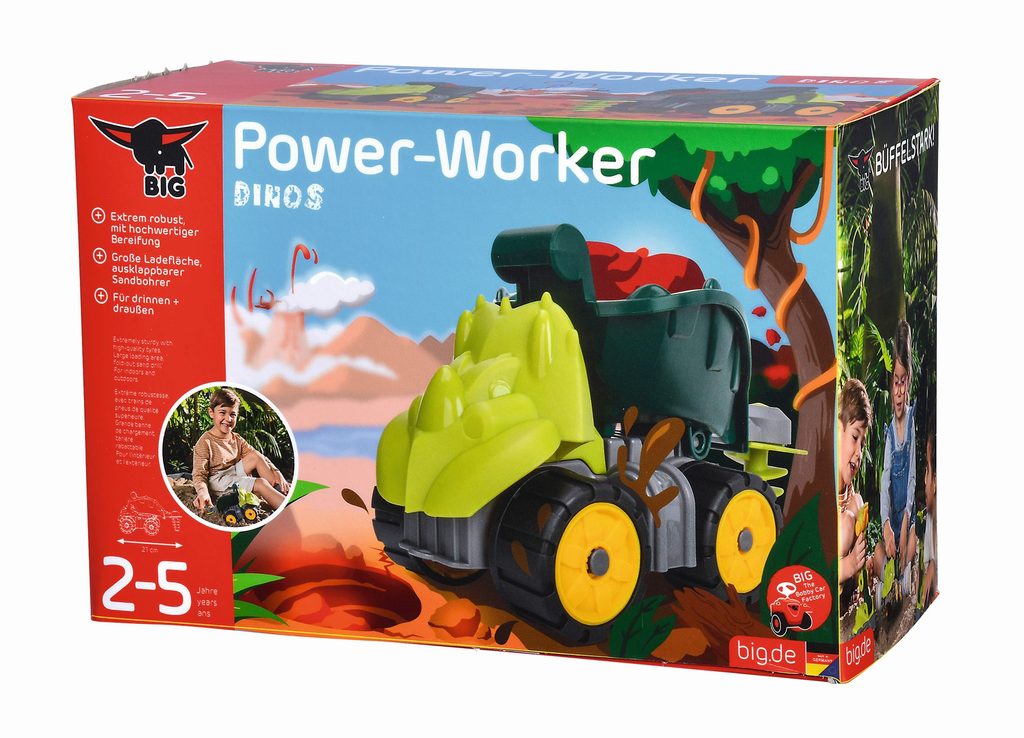 Nákladní auto mini Dino z řady Power Worker z kvalitního plastu s kapotou ve tvaru Triceratopse, výklopnou ložnou plochou a zadním sklopným vrtákem. Kvalitní pneumatiky z měkkého plastu, který nezanechává stopy. Po použití v písku lze hygienicky vyčistit pod tekoucí vodou. Rozměry: 21 x 10 x 17 cm.