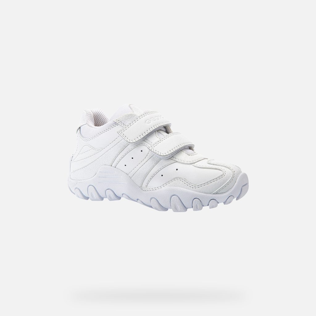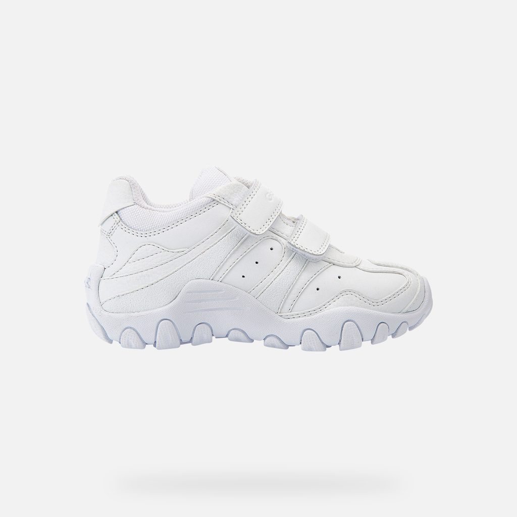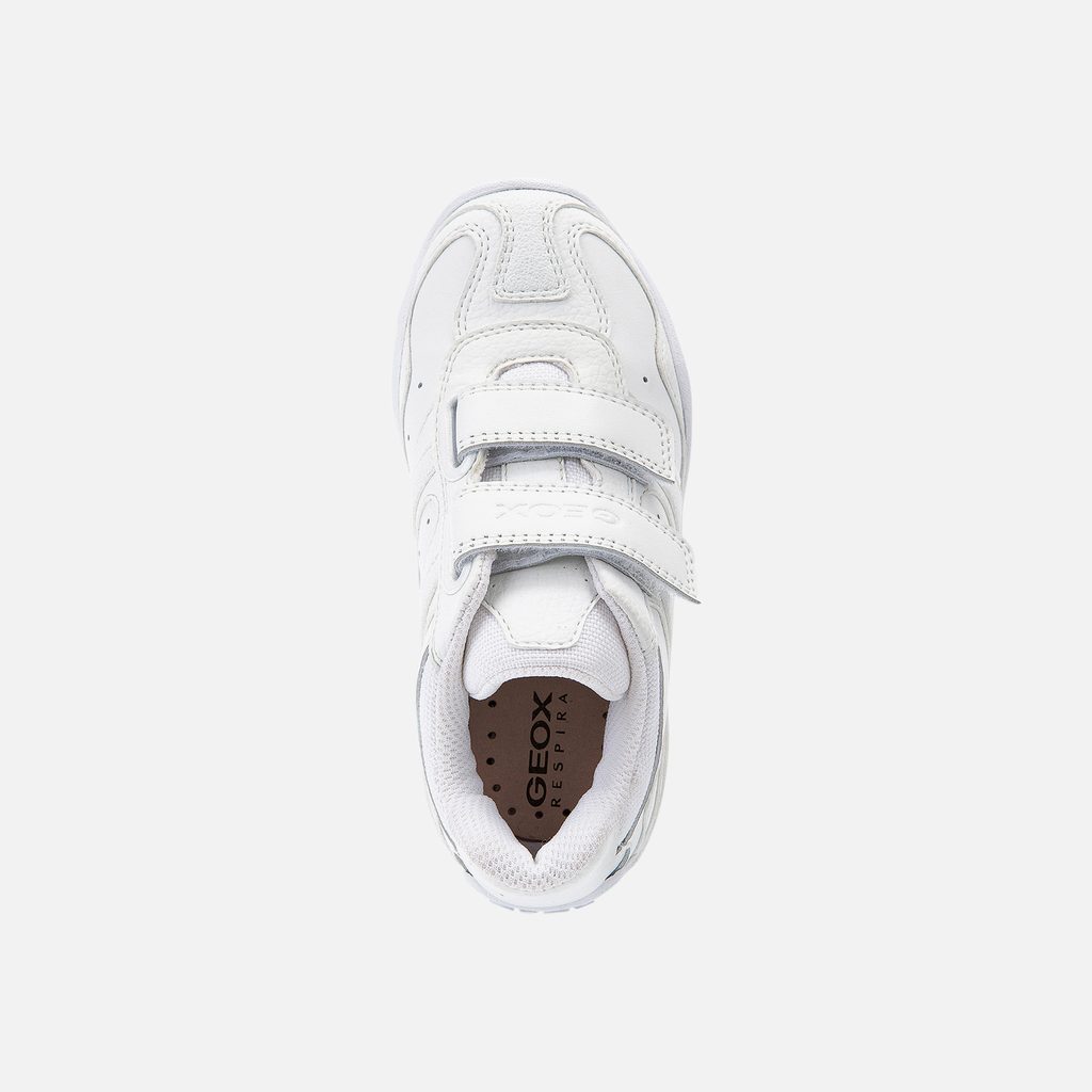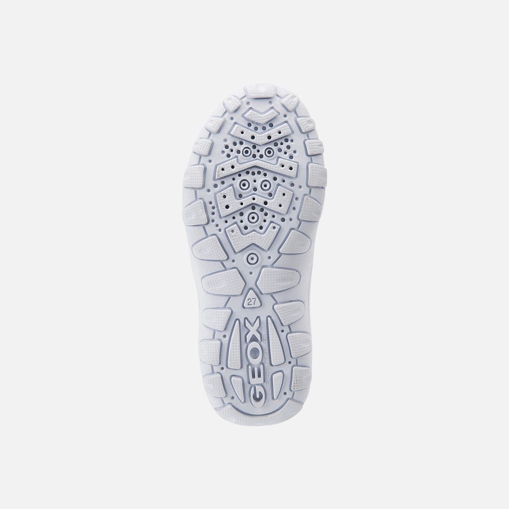 Bílé chlapecké tenisky Geox Crush zaujmou čistým designem a praktickým provedením. Dva suché zipy zajišťují snadné obouvání a nastavení ideální šířky, zatímco perforace po stranách podporují cirkulaci vzduchu. Výrazná podrážka s vlnitým vzorem zajišťuje dobrou přilnavost.