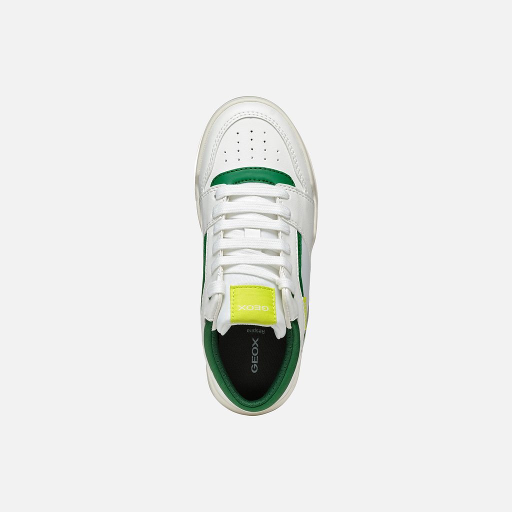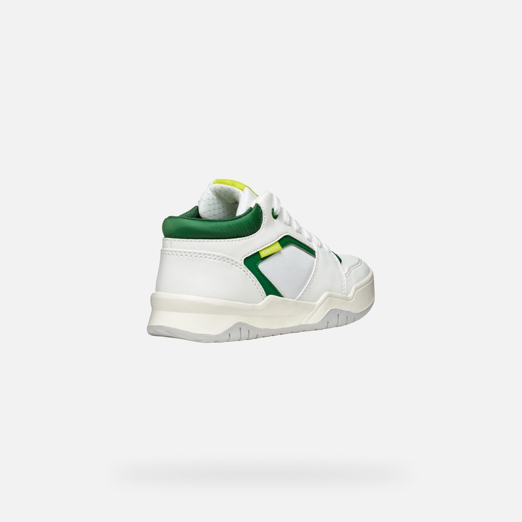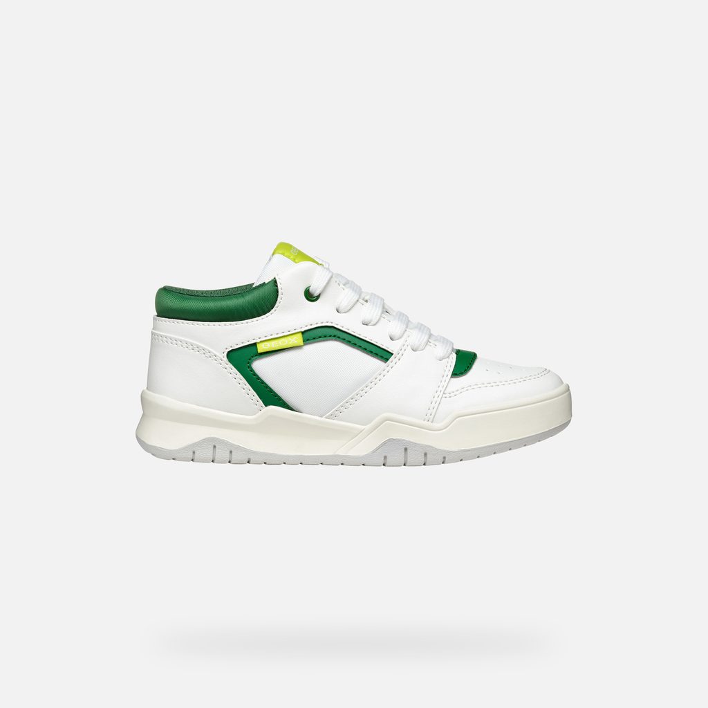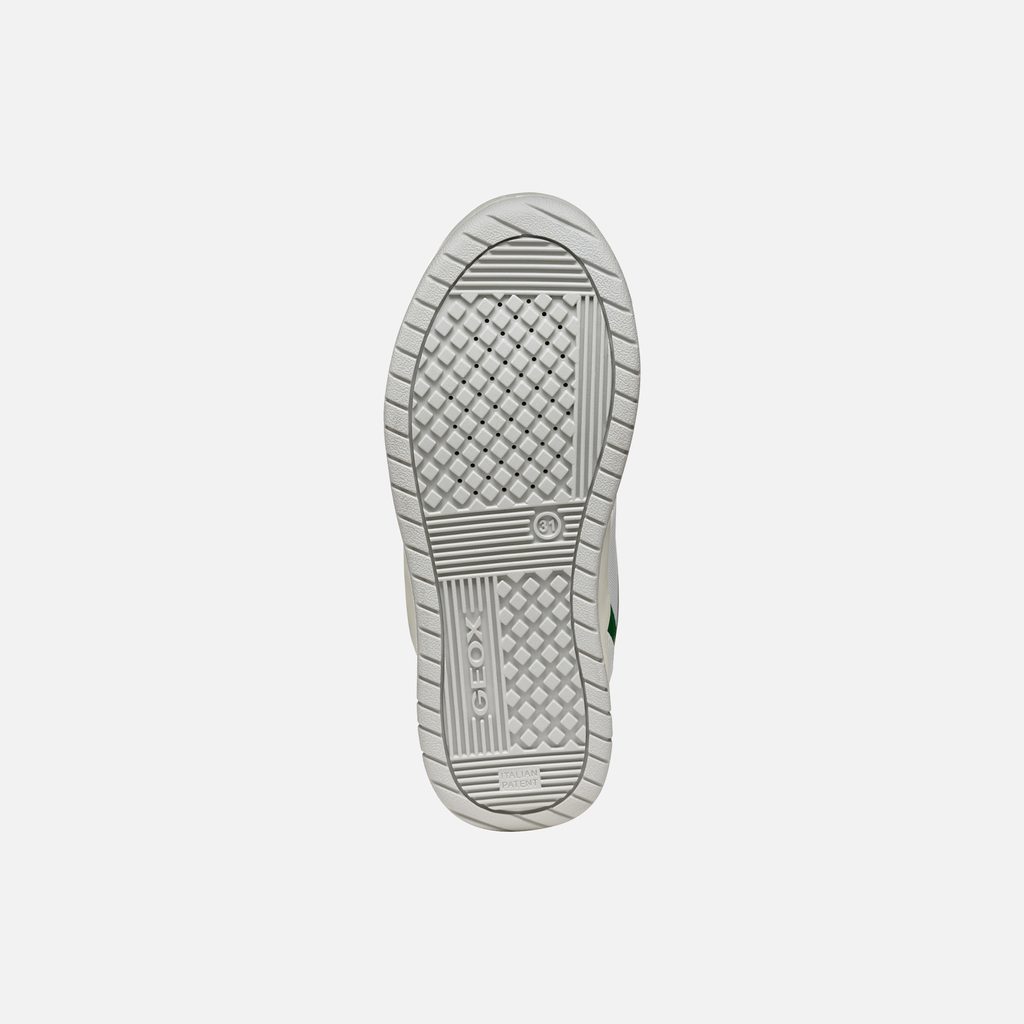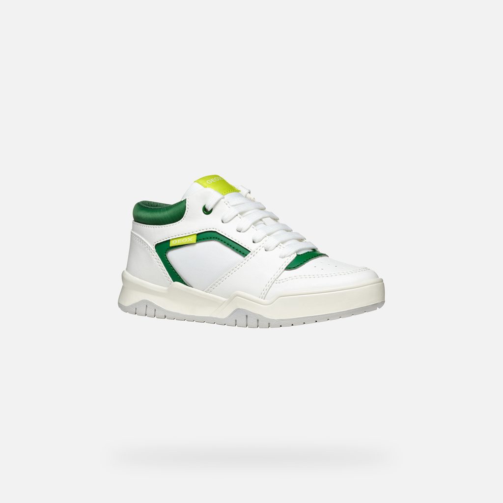 Stylové bílé tenisky Geox Perth pro chlapce zaujmou svým sportovním designem. Vynikají čistými liniemi v bílé barvě, které doplňují výrazné zelené detaily na jazyku, očkách pro tkaničky a kolem kotníku. Praktickým prvkem je texturovaná světle šedá podrážka pro lepší přilnavost.