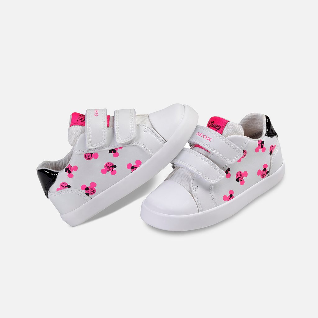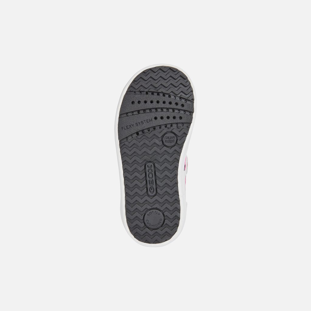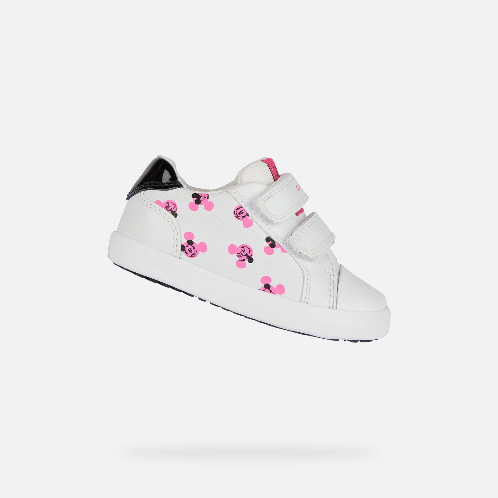 Lehké prodyšné tenisky nízkého střihu pro děti navržené v rámci partnerství značek Geox a Disney. Kilwi jistě zaujme menší děti svým bílo-neonově růžovým svrškem oživeným celoplošnými grafickými vzory Mickey Mouse. Je vyrobena z pružné nappy a materiálu s koženým efektem a spojuje v sobě moderní hrany a bezkonkurenční pohodlí.