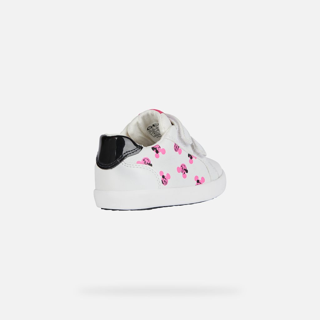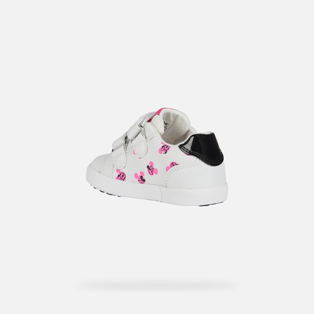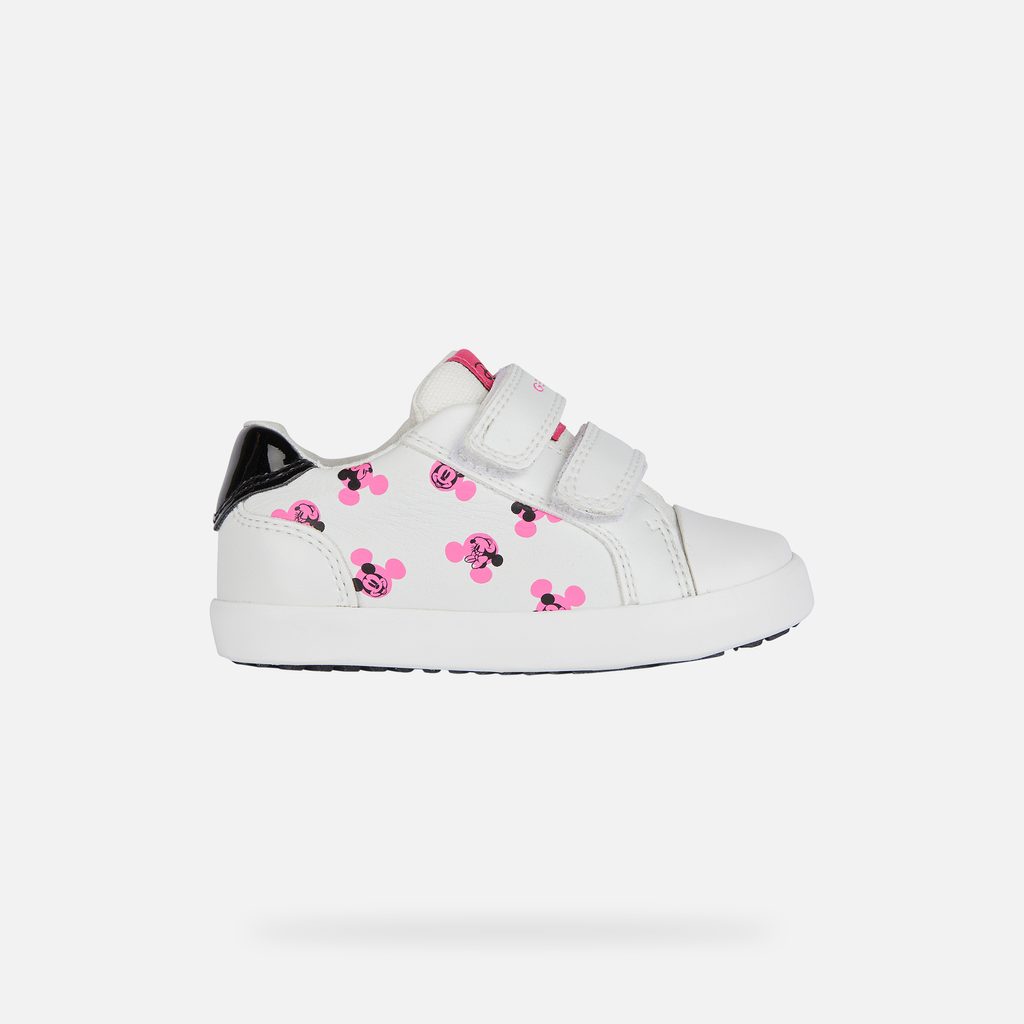 Lehké prodyšné tenisky nízkého střihu pro děti navržené v rámci partnerství značek Geox a Disney. Kilwi jistě zaujme menší děti svým bílo-neonově růžovým svrškem oživeným celoplošnými grafickými vzory Mickey Mouse. Je vyrobena z pružné nappy a materiálu s koženým efektem a spojuje v sobě moderní hrany a bezkonkurenční pohodlí.