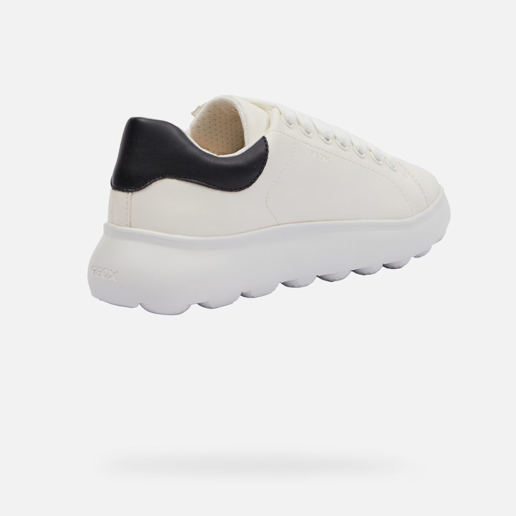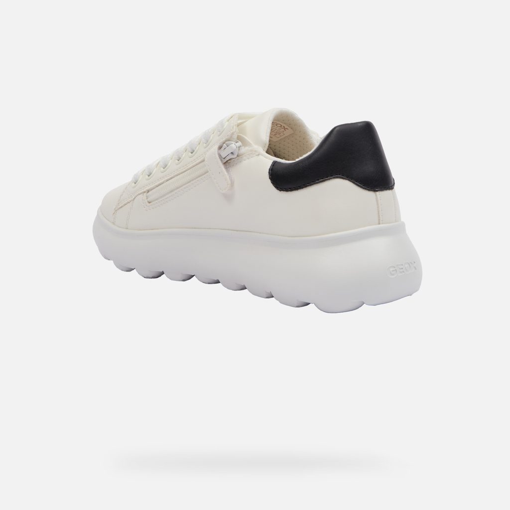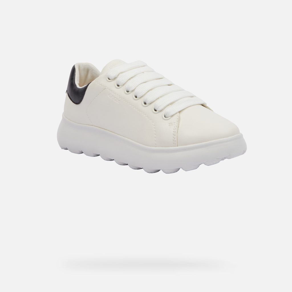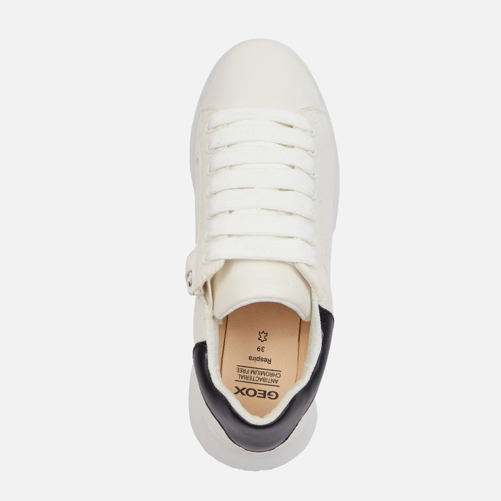 Bílé dívčí tenisky Geox Puffypop zaujmou svým moderním minimalistickým designem. Klasické bílé provedení doplňuje černá patní část, která vytváří elegantní dvoubarevný kontrast. Charakteristickým prvkem je výrazná vlnitá podrážka s oblačným vzorem.